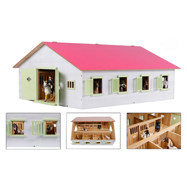 Pferdestall rosa aus Holz 1:24 mit 7 Boxen für Pferde, 72.5x60x30cm, Zubehör nicht im Lieferumfang enthalten.