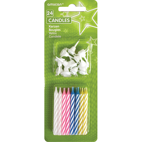24 Kerzen mit 12 Halter in den Farben pink, weiss, gelb und blau für auf den Geburtstagskuchen.