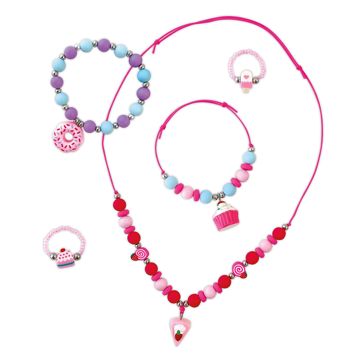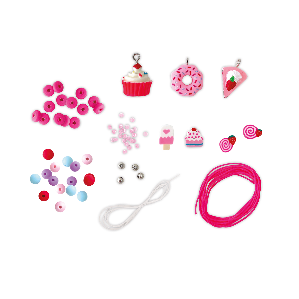 Der perfekte Augenschmaus für Feinschmecker! Mit diesem Kreativ-Set kannst du 1 Halskette, 2 Armbänder und 2 Ringe aus Perlen und Anhängern in Form von Gebäck, Süßigkeiten oder anderen Leckereien herstellen. Es enthält 3 „süße“ Anhänger (ein Mini-Donut, ein Stück Erdbeere, ein Cupcake), 3 „süße“ Perlen (ein Eis, ein Cupcake, ein Erdbeerkuchen), 35 runde Perlen, 15 große Heishi-Perlen, 60 Rocaille-Perlen, 35 silberfarbene Perlen, Gummiband, rosafarbenen Faden und 1 Heft mit Anleitungen und Vorlagen. Diese Aktivität fördert Geduld und Fingerfertigkeit. Sie ist ideal für Kinder ab 6 Jahren.