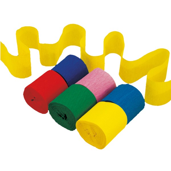 Kreppbänder in den Farben: rot, grün, gelb, blau, türkis und rosa zum dekorieren an Geburtstagen, Sylvester oder an der Fasnacht. Masse: 5 cm x 10 m