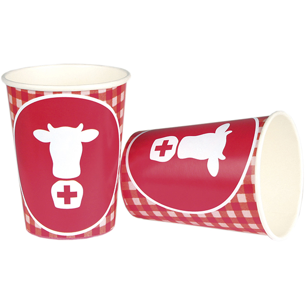 Untersetzer rot mit Kuhmotiv, werden assortiert im Set à 4 Stück geliefert. Kann als Dekoration für Ihre 1. Augustfeier verwendet werden.