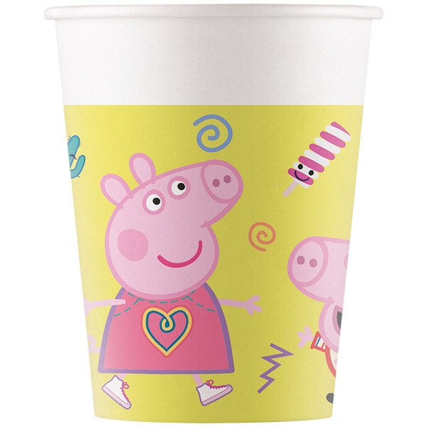 Papier-Becher mit Motiv Peppa Pig mit eine Hinhalt von 200ml. Diese bunte Becher sind genau die richtige Dekoration für einen farbenfrohen Kindergeburtstag. Packung à 8 Stk.