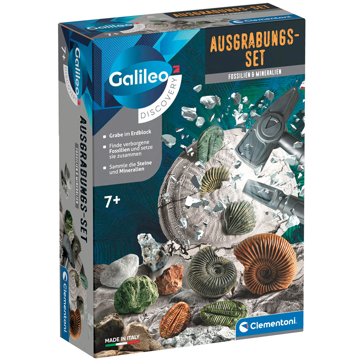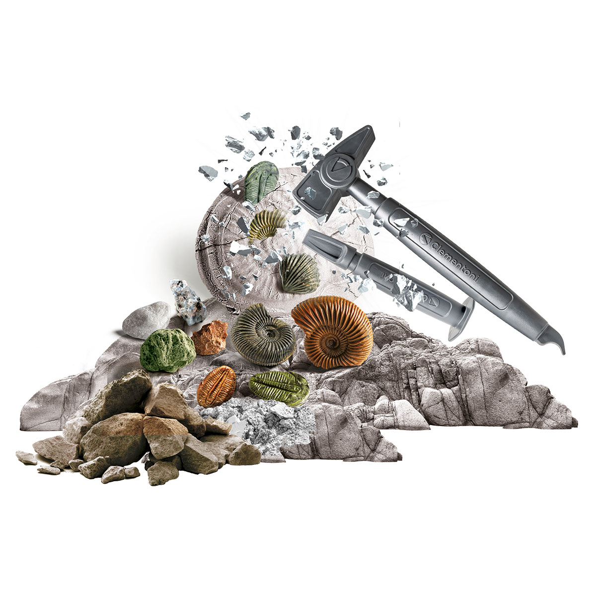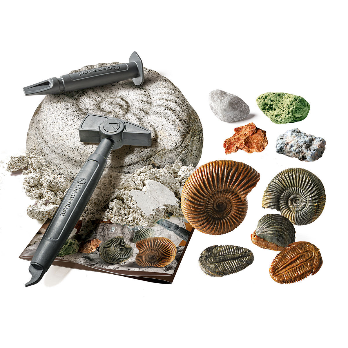 Ausgrabungsset Fossilien & Mineralien. Ein wissenschaftliches Set, um die Wissenschaft der Paläontologie zu entdecken. Ein Stein in Form eines Ammoniten, der ausgegraben werden kann, um verschiedene Arten von Fossilien und Gesteinen zu finden, die alle untersucht und gesammelt werden können. Das Set enthält sämtliches Zubehör, um die im Handbuch vorgeschlagenen Aktivitäten auszuführen.