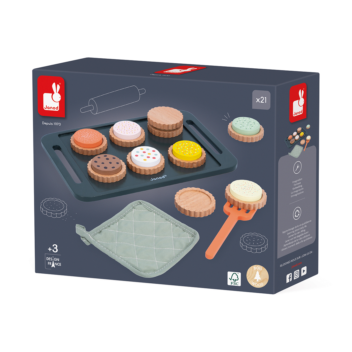 An die Backöfen, ihr kleinen Bäckerinnen und Bäcker, dann sind die Kekse bald gebacken! Was gibt es Besseres als dieses Keks-Set, um den Großen nachzueifern? Dieses Set, bestehend aus einem Backblech, einem Bratenwender, einem Topflappen sowie 10 Keksen in 8 verschiedenen Geschmacksrichtungen, hat alles, was man braucht, um das beste Gebäck zu kreieren. Rollenspielzeug aus Holz für Kinder ab 3 Jahren.