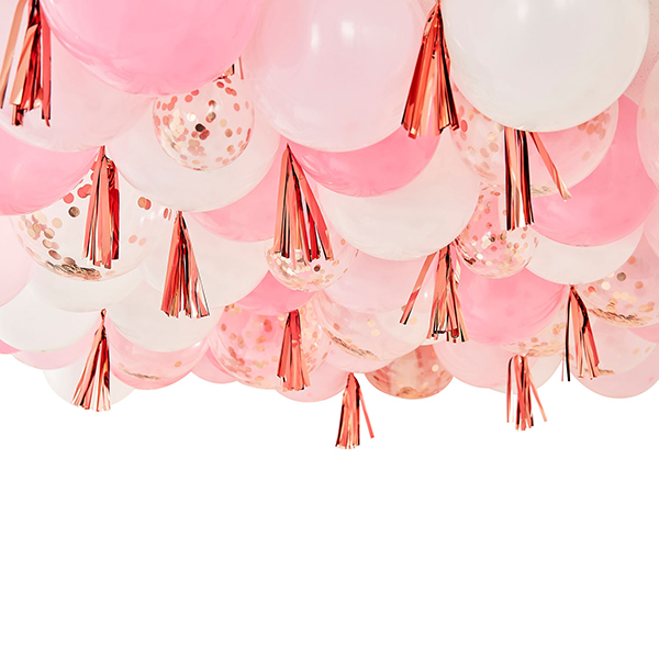 Diese Ballon-Deckendekoration bringt Ihre roségoldene Partydekoration auf die nächste Stufe! Dieses Dekorationsset verwandelt jeden Raum, um Ihr Thema zu vervollständigen. Schauen Sie sich unser Mix It Up-Sortiment für Partyzubehör für alle Gelegenheiten an. Ob Sie eine fabelhafte Fotokabine, ein wunderschönes Partygeschirr oder ein auffälliges Ballon-Herzstück wünschen – die Mischung macht alles! Jede Packung enthält 160 mit rosa, weissem und roségoldenem Konfetti gefüllte Luftballons in 5 und 12 Zoll. 15 roségoldene Quasten mit elastischen Bändern, 15 roségoldene Luftschlangen, 15 Meter Ballonband, durchsichtiges Garn, 100 Klebepunkte