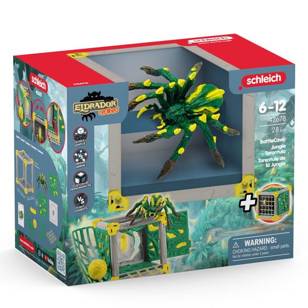BattleCave Dschungeltarantel. Zur Verteidigung steht in jedem BattleCave ein starkes Creature bei! Kann mit anderen BattleCaves zu großen Festungen gestapelt und gestellt werden. Jede Wand kann individuell ausgetauscht werden und der Würfel so neukonfiguriert. Die grosse Kugel kann über die Rollbahn auf Gegner losgelassen werden. Durch die gut getarnte Lianenfalltür fallen Angreifer von oben durch. Der Weltenkristall ist an einer Drehtür befestigt und kann so in letzter Sekunde gerettet werden.