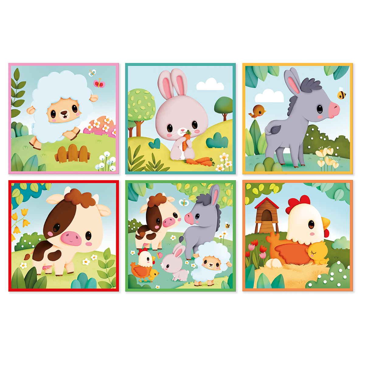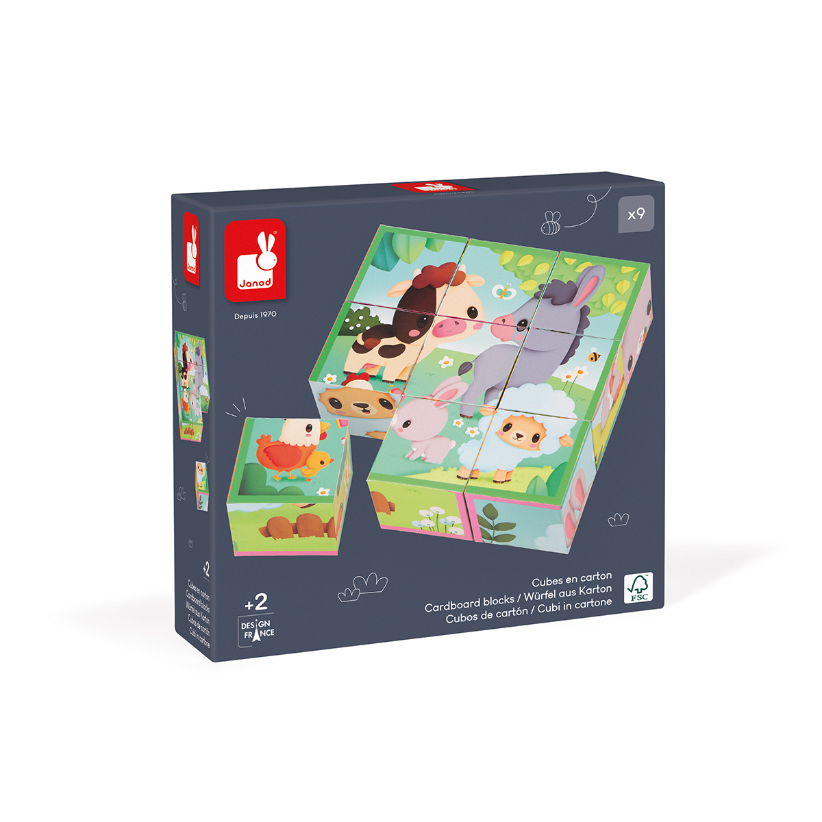 Lasst uns einen kleinen Ausflug auf den Bauernhof machen, um all seine goldigen Tiere zu entdecken! Hier sind 9 Würfel aus Pappe, mit denen man 6 Szenen zum Thema Bauernhoftiere zusammenstellen kann: ein Schaf, ein Kaninchen, ein Esel, eine Kuh, ein Huhn mit seinem Küken und alle Tieren zusammen. Eine farbige Umrandung, die bei jedem Puzzlebild anders ist, hilft dem Kind. Leichte, einfach zu handhabende Würfel, perfekt zur Förderung der Feinmotorik der Kleinen und der Fantasie der Größeren. Lernspielzeug aus Karton. Für Kinder ab 2 Jahren