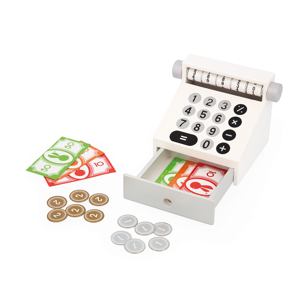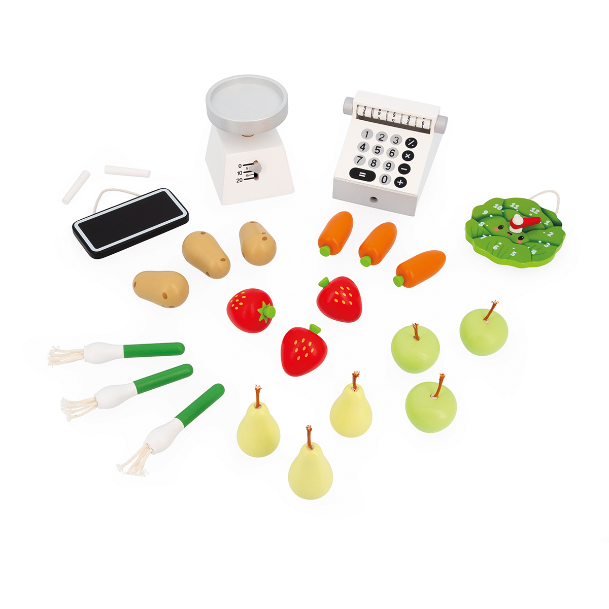 Der Laden hat geöffnet! Kommt und erkundet diesen schönen Kaufmannsladen - perfekt für angehende Verkäufer. Der Farm Market Kaufmannsladen ermöglicht es Kindern ab 3 Jahren, ihr eigenes Geschäft zu gründen und sich viele Kaufsituationen auszudenken. Dieses schöne Rollenspielzeug ist mit einer Uhr und einer Schiefertafel ausgestattet, um die Preise zu addieren oder die Öffnungszeiten aufzuschreiben. Ebenfalls enthalten sind eine Schachtel Kreide, fünf Lebensmittelpackungen (Erbsen, Mehl, Milch, Apfelsaft und Käse), eine Waage, eine Kasse mit Geldscheinen sowie Münzen, um die Rechnung zu bezahlen! In den Fächern des Holz-Kaufmannsladens kann Ihr Kind das mitgelieferte Obst und Gemüse (3 Äpfel, 3 Birnen, 3 Erdbeeren, 3 Karotten, 3 Lauchstangen und 3 Kartoffeln) legen und auf die Tafel vor jedem Fach den Preis der Artikel schreiben. Genau wie in einem echten Laden gibt es braunes Papier zum Einwickeln des Gemüses, bevor es den Kunden überreicht wird. Und für die Grosseinkäufer gibt es zwei umweltfreundliche Einkaufsnetze zum Verstauen der Einkäufe! Praktisch, der Kaufmannsladen ist mit drei Holzzapfen ausgestattet, an die Taschen oder anderes Zubehör aufgehängt werden können. Insgesamt sind mehr als 32 Zubehörteile in diesem Holzspielzeug enthalten, das stundenlangen Spass rund um den Verkauf von Obst und Gemüse verspricht! Rollenspielzeug aus Holz. Spielzeug für Kinder ab 3 Jahren.