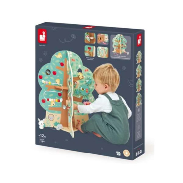 Sehen Sie sich den Baum genauer an, um alle Aktivitäten zu entdecken, die in seinen Ästen versteckt sind. Und wenn Sie genau hinschauen, werden Sie bemerken, dass der Frühling allmählich in den Sommer übergeht ... Nanu? Riecht es hier etwa nach Äpfeln? Aber ja! Suchen Sie diesen Apfel, der so gut duftet!! Dieser Baum umfasst mehr als 20 Aktivitäten: Filzblätter zum Anfassen, 1 Labyrinth, 1 Stapel-Hase, 1 Maus zum Einsetzen, 1 Vogel zum Schrauben, 1 Apfel zum Riechen, 1 Motorikschleife mit Perlen, 1 doppelter, drehbarer Spiegel, 1 Blatt, um Verstecken zu spielen, 1 Abseilgerät für den Specht, 1 Blume zum Drehen, die Geräusche macht, 1 Zahnradpaar, 3 Silikonoberflächen, 1 Formsortierer, Unverwechselbarkeitsspiel mit Vogel und Schmetterling zum Stecken, 1 akustisches Rad mit einem Glöckchen aus Metall. Fördert Feinmotorik und Vorstellungskraft. Aktivitätsspielzeug aus FSCTM-Holz, für Kinder ab 12 Monaten.