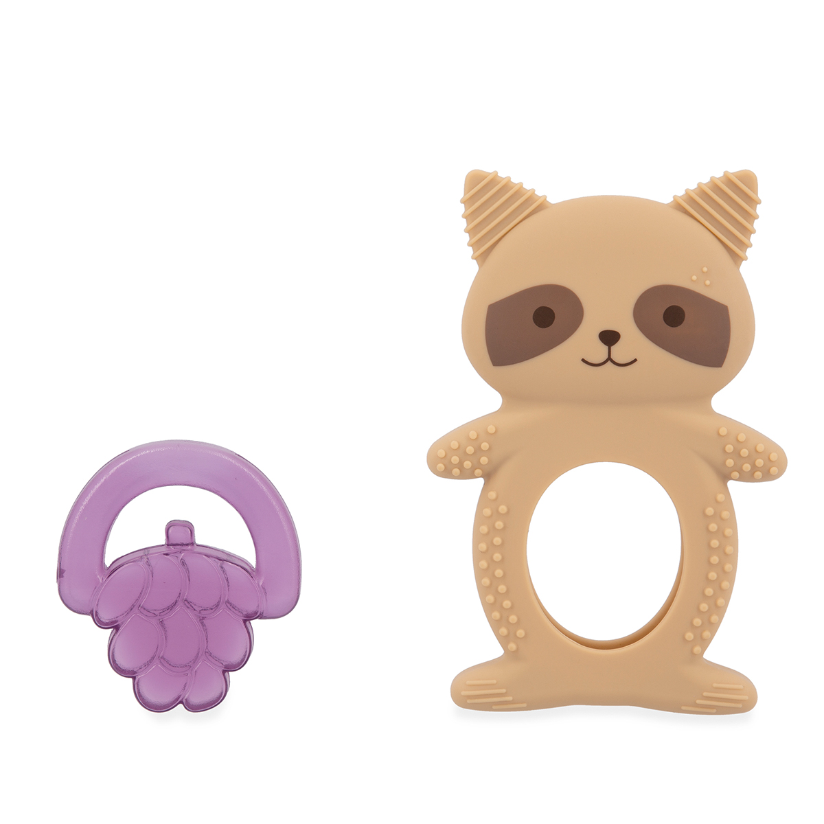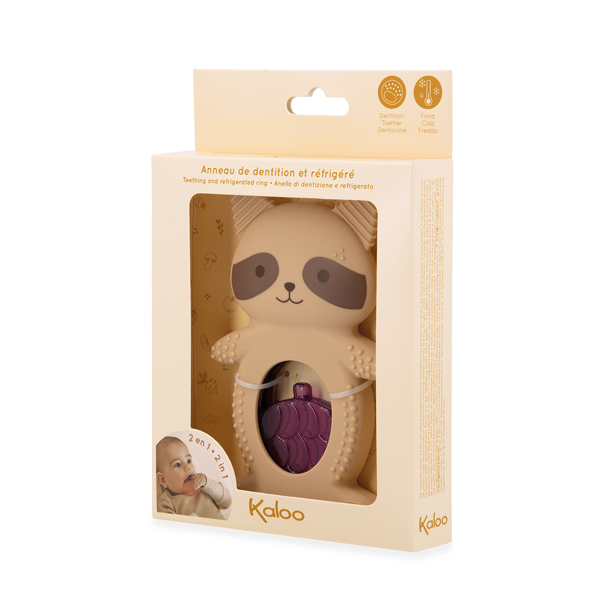 Dieses Duo aus Zahnungshilfe und Kühlung wurde entwickelt, um Baby bei seinen ersten Zahndurchbrüchen zu begleiten. Ideal zur Linderung von Babys starken Schmerzen, besteht es aus einem Silikon-Element in Form eines Tieres und einem Kühlelement in Form einer Frucht. Einfach zu verwenden: Die Frucht maximal 10 bis 20 Minuten in den Kühlschrank legen, um die Zahnfleischschmerzen zu lindern. Der Waschbär aus weichem Silikon hat verschiedene Muster, um die Sinne zu stimulieren und die lindernde Wirkung zu verstärken. ACHTUNG: Nicht ins Gefrierfach legen. Nur Oberflächenreinigung. Ab 6 Monaten.