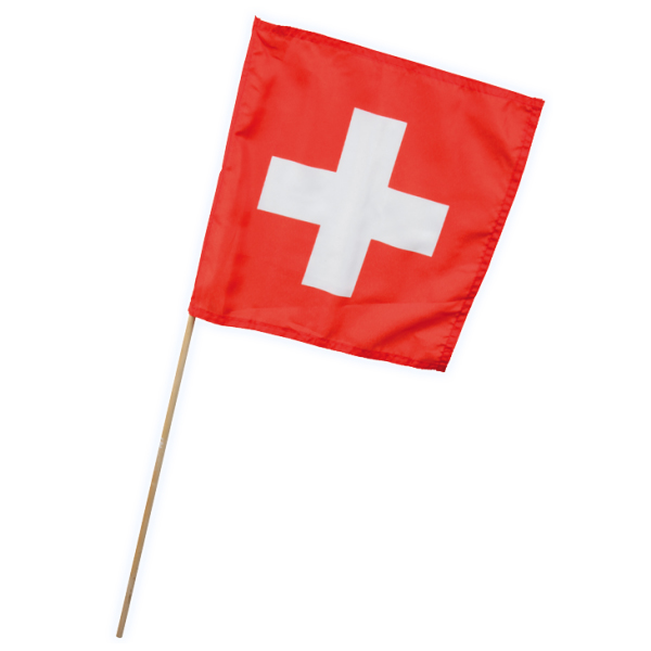 Stabfahne rot mit CH Kreuz aus Stoff. Passend als Dekoration für die 1. August Feier.