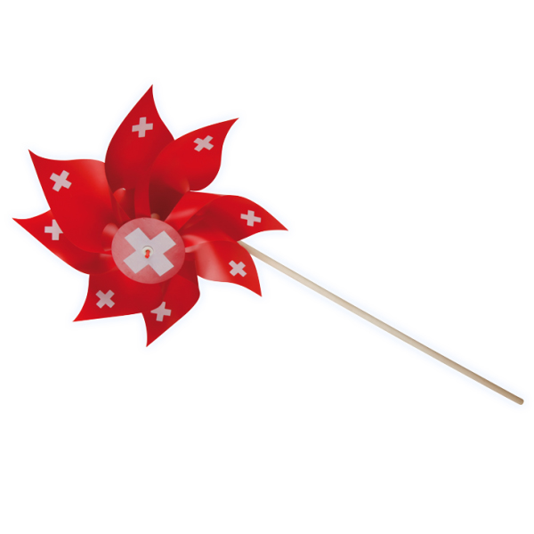 Windrad, rot mit CH Kreuz, ca. 25cm. Kann als Dekoration für Ihre 1. Augustfeier verwendet werden.