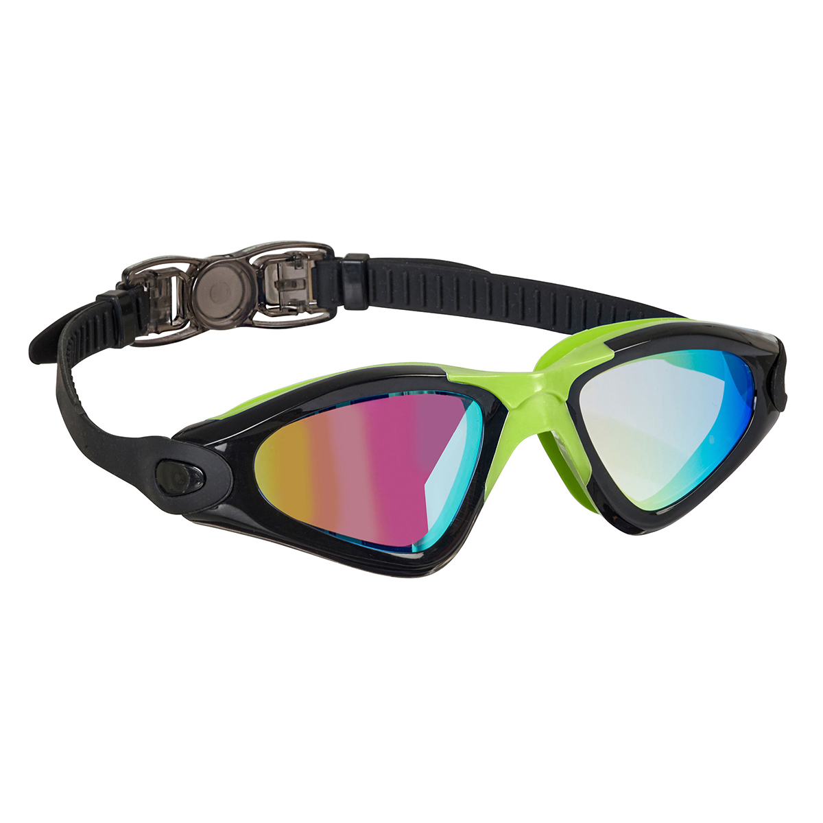 Trainingsschwimmbrille mit grossem Sichtfeld und anschmiegsamer Dichtung. UV-Schutz und Antibeschlag. Linsen aus Polycarbonat, Rahmen, Dichtung und Kopfband aus Silikon.