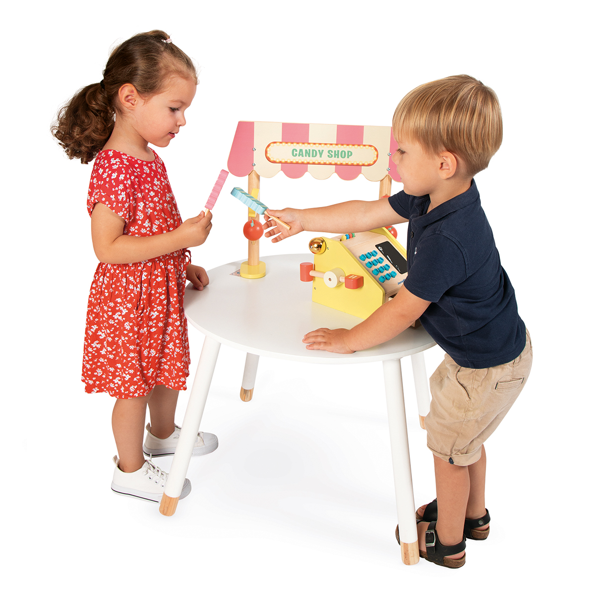 Wer möchte einen karamellisierten Liebesapfel? Oder lieber einen Bonbon? Dieser hübsche Laden hat alles, was wir brauchen! Das aus einem Süßigkeitenstand, 6 Süßigkeiten und einer Registrierkasse bestehende Nachahmungsspielzeug ist ideal, um die Erwachsenen nachzuahmen! Die Registrierkasse sieht wie echt aus: mit Tasten zum Berechnen des Betrags, einer Tafel zum Notieren der Bestellung, einem Kreideset und auch Scheinen und Münzen aus Karton zum Verstauen in der Schublade der Kasse. Wenn ein Bonbon bezahlt ist, schließt das Kind die Schublade, und das Glöckchen klingelt – es ist bezahlt! Dieser Laden verspricht stundenlangen Spielspaß mit Freunden und mit der Familie und regt die Fantasie Ihres Kindes an. Nachahmungsspielzeug aus Holz. Für Kinder ab 3 Jahren.