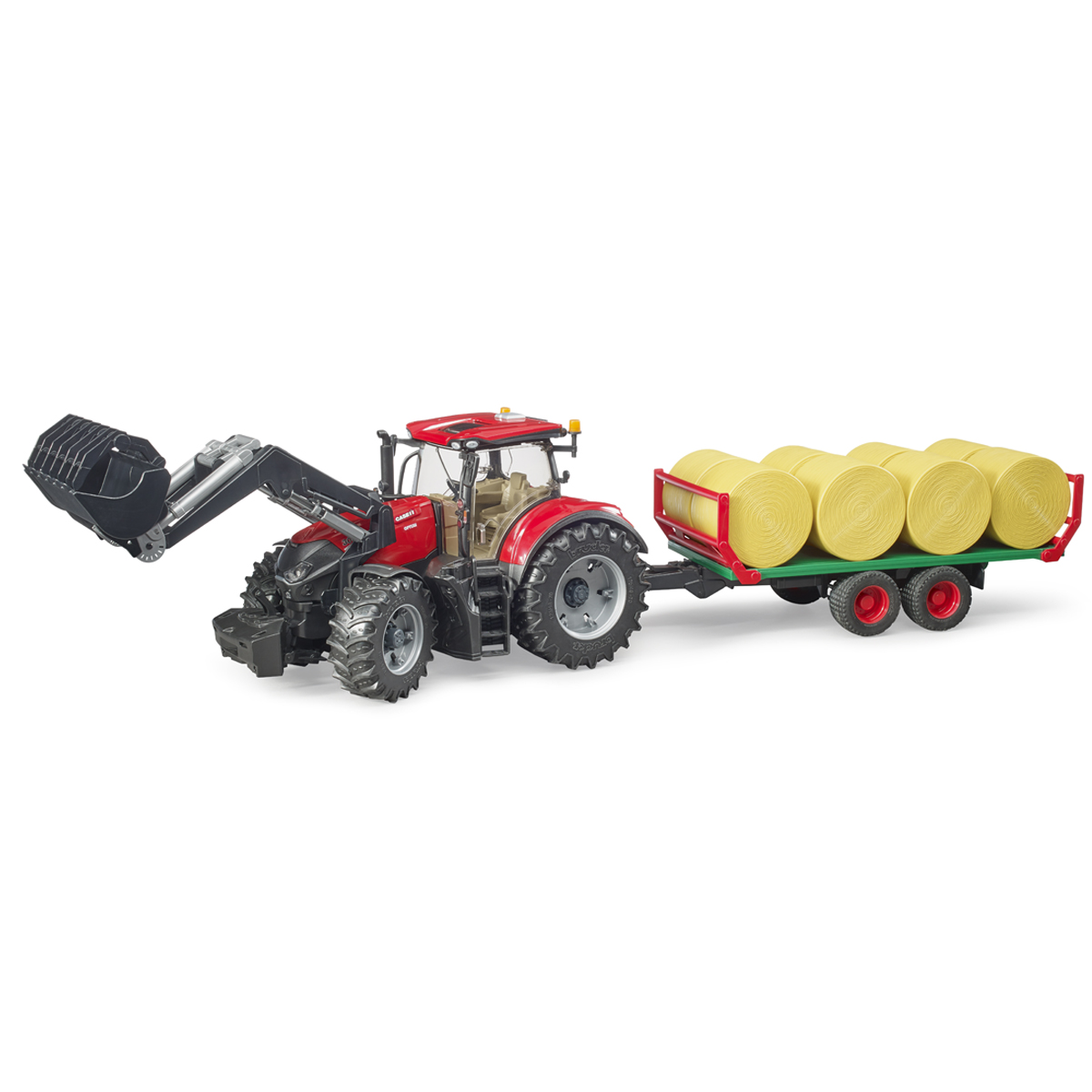 Vor allem der Herbst ist die Zeit, in der die überall zu sehenden Silage- und Strohrundballen vom Bauern in den Stall, oder in die Scheune gebracht werden müssen. Für diese Tätigkeiten gibt es ein neues, faszinierendes Gespann von BRUDER. Die Optum Baureihe bietet leistungsstarke, kompakte und äusserst wendige Traktoren mit einem exzellenten Leistungsgewicht. Diese Modelle meistern jede Arbeit mit maximaler Leistung, Effizienz und Zuverlässigkeit und beeindrucken durch ihr neues Design. In Sachen Design, Funktionalität und Qualität steht das neue Modell von BRUDER im Massstab 1:16 dem Vorbild in nichts nach, getreu dem Motto - just like the real thing. Die Fahrerkabine ist voll verglast und die Türen sind einfach zu öffnen. Die aufklappbare Motorhaube gewährt Einblick auf den imposanten Motor. Ausgezeichnete Steuerbarkeit und Fahrkomfort werden durch die eingebaute Pendelachse und die durch das Schiebedach einsetzbare Lenkverlängerung erreicht. Für noch mehr Spielwert ist bei diesem Modell ein voll funktionsfähiger Frontlader montiert. Durch die höhenverstellbare Heckkupplung können alle Anhänger der Profiserie benutzt werden. Für noch mehr Spielspass sind die neuen, abnehmbaren Räder angebracht. Selbstverständlich passen an diesen Traktor alle landwirtschaftlichen Anhänger und landwirtschaftlichen Arbeitsgeräte aus dem Hause BRUDER. Der BRUDER Ballentransportanhänger zeichnet sich durch klappbare Begrenzungs-Rungen aus und wird mit 8 Rundballen ausgeliefert. Damit ist dieser Anhänger der perfekte Partner für den Ballentransport. Zur Erweiterung des ohnehin schon grossen Spielwerts, kann aus dem grossen bworld Sortiment das Figurenset Landwirt (Art.-Nr. 310.62610) dazu kombiniert werden.