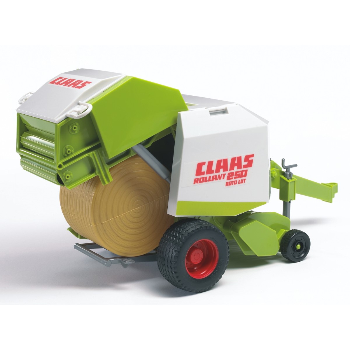 Die Claas Rollant 250 Rundballenpresse ist mit Pick-up abklappbar und wird über Tasträder angetrieben. Der Seitendeckel und das Presseheck können geöffnet werden. Der eingelegte Ballen wird durch Betätigen der Ablagewippe selbsttätig ausgeworfen. Über eine Anhängerkupplung kann der Ballenwickler angebracht werden (Ballenwickler nicht im Lieferumfang enthalten). Ein Rundballen ist im Lieferumfang enthalten und Profilreifen runden das Bild ab. Zur Spielergänzung kann die Claas Rollant 250 Rundballenpresse mit allen Traktoren der Profi-Serie sowie dem Ballenwickler Art.-Nr.: 02122 kombiniert werden.
