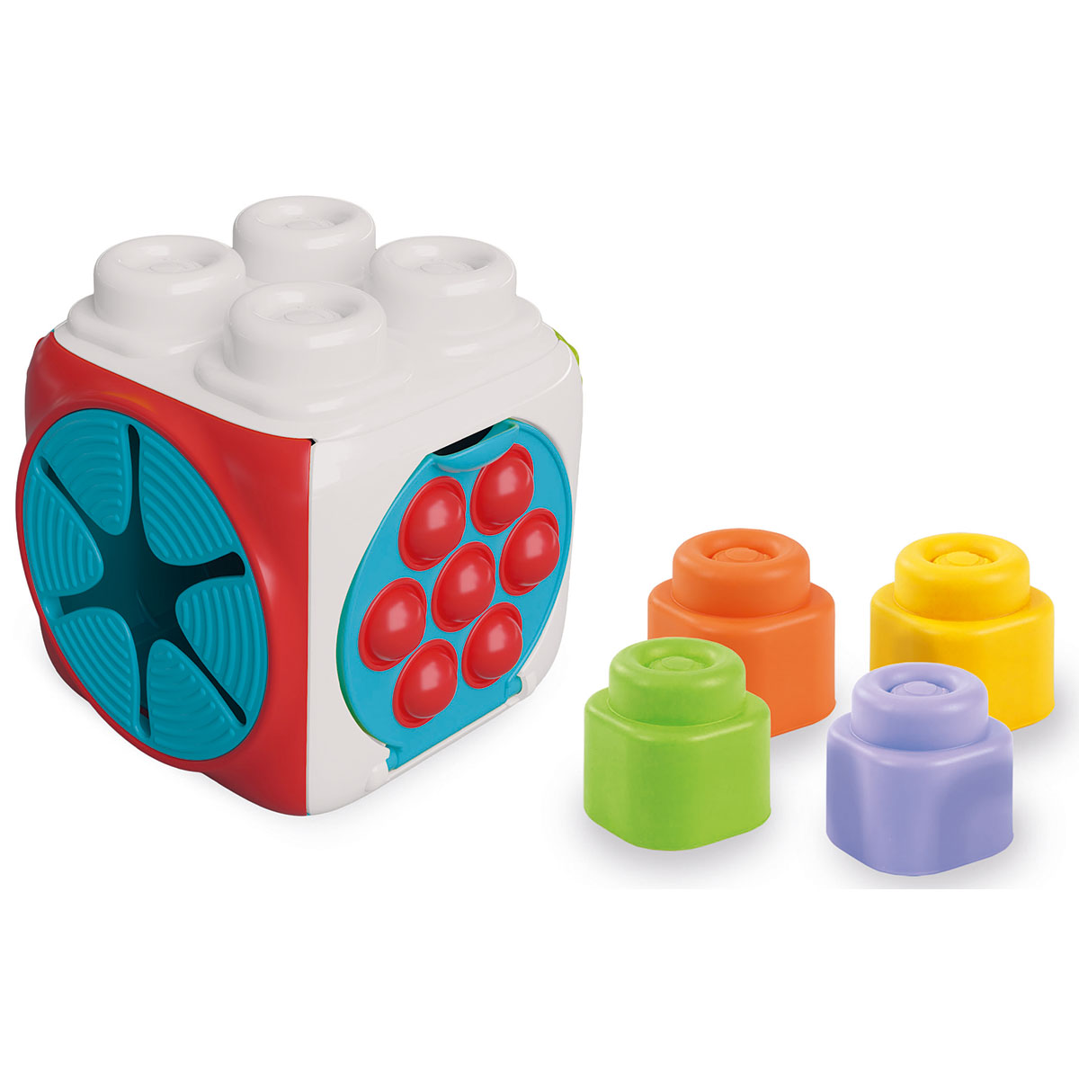 Ein Würfel voller geprägter Texturen, die es zu erkunden gilt, viele Aktivitäten, die die manuelle Geschicklichkeit des Babys fördern, und 4 weiche Bausteine zum Spielen. Das Kind drückt auf die kleinen Kugeln, damit der Würfel auf der gegenüberliegenden Seite herausragt. Durch Drücken auf das flexible Band kann es auf und ab schalten. Spiele die die Kleinen immer wieder aufs Neue begeistern.
