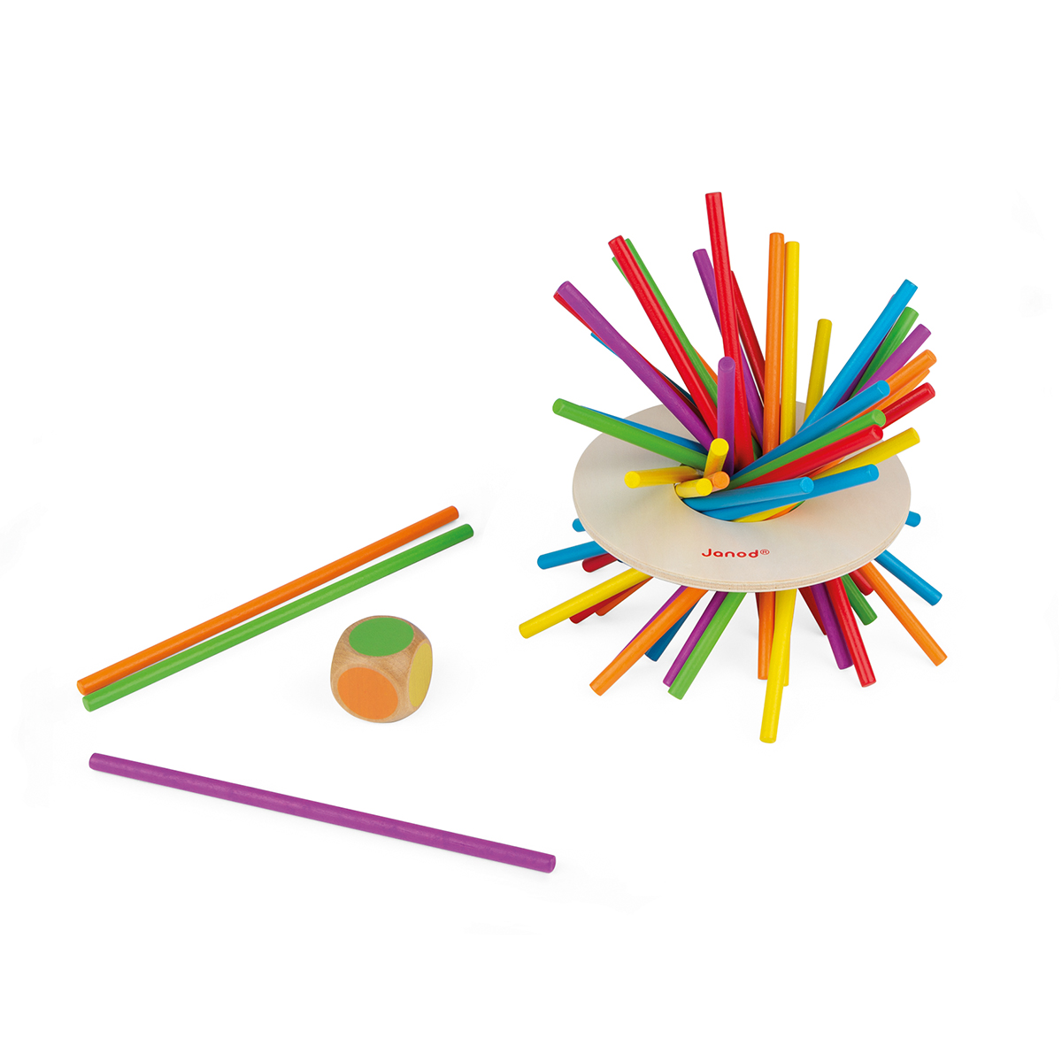 Zeige, dass du eine ruhige Hand hast, und besiege deine Gegner, indem du die meisten Stäbchen entfernst! Aber Vorsicht! Wenn die Scheibe den Tisch berührt, ist das Spiel verloren! Dieses Spiel entwickelt die Feinmotorik, strategisches Denken und das Zuordnen von Farben. 36 Stäbchen, eine Scheibe und ein Würfel aus Holz. Für 2 bis 6 Spieler. Scheibe : Ø 13 cm. Stäbchen : 17,5 cm x Ø 0,6 cm. Mit Anleitung auf Französisch, Englisch, Deutsch, Niederländisch, Spanisch und Italienisch.