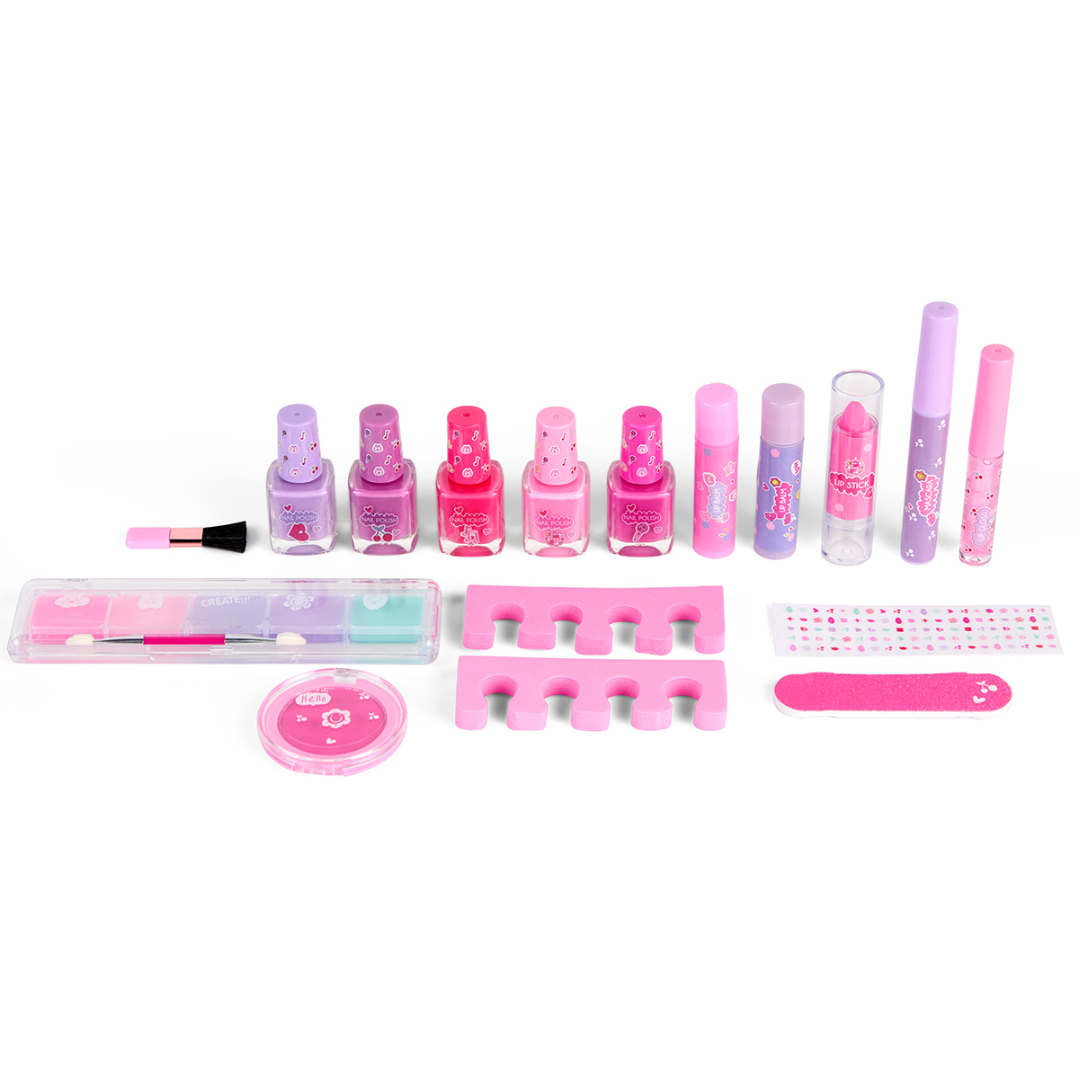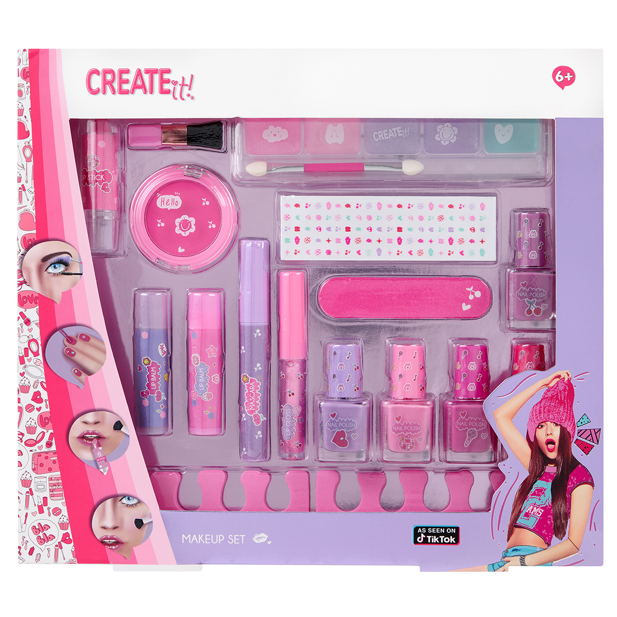 Create it! Make up Set gefüllt mit Lidschatten, Schwammpinsel, Rouge, Rougepinsel, Lippenstift, Lipgloss, Nagellack, Nagelfeile.
