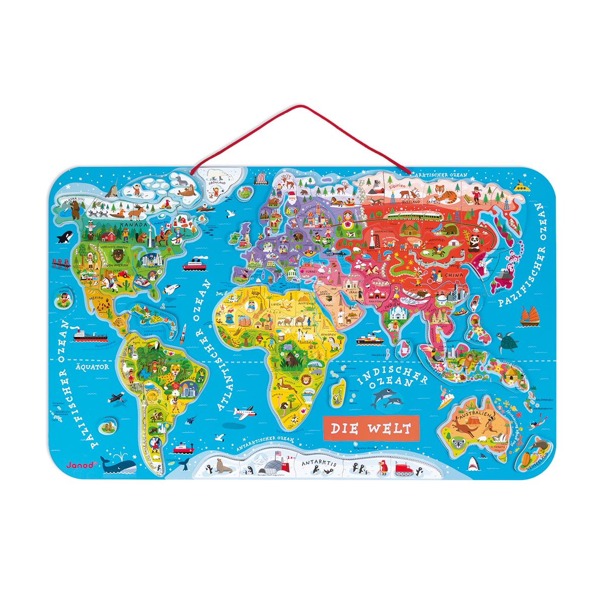 Landkarten-Puzzle mit 92 magnetischen Puzzle-Teilen. Jeder Magnet stellt ein Land oder eine Gegend der Welt dar. Darauf sind der Name, die Hauptstadt und ein typisches Bild der Region abgedruckt. Die große magnetische Tafel stellt die Welt mit den Kontinenten und Ozeanen dar. Jede Gegend hat ihre eigene Farbe, dies hilft dir beim Finden des richtigen Platzes! Den richtigen Platz für jedes Land zu finden macht richtig Spass und sobald du fertig bist, hast du eine wunderschöne Weltkarte, die du aufhängen kannst. Eine lustige und lehrreiche Art, unseren Planeten zu entdecken. Reise um die Welt mit 92 Magneten! Landkarte aus Holz mit 92 Magneten im Set. Geeignet für Kinder von 7-12 Jahren. Verwendete Sprache auf der Landkarte ist Deutsch.