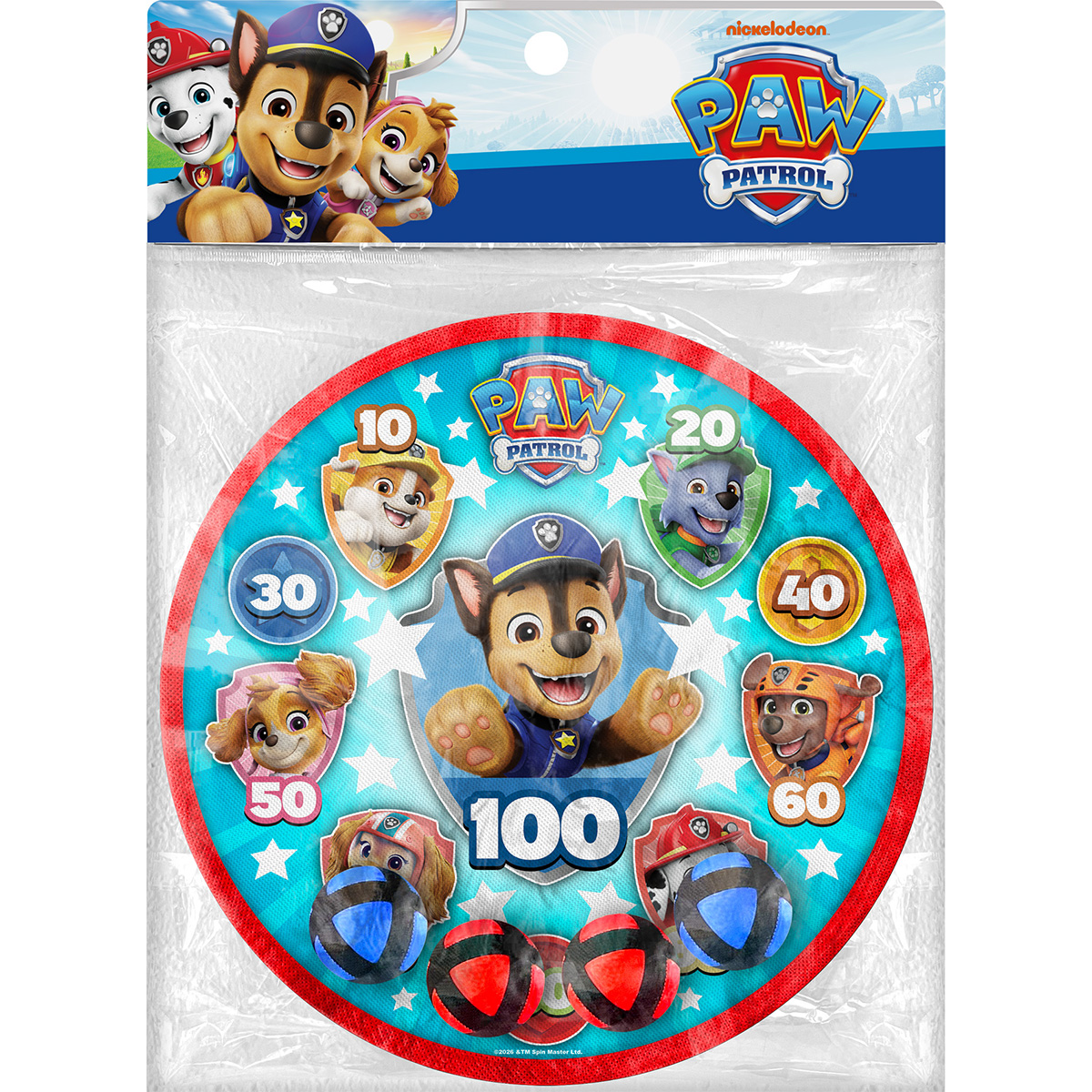 Weiche Klettbälle und eine 28 cm große Zielscheibe. Sicheres Dartspiel für Kinder – im Paw-Patrol-Stil.
