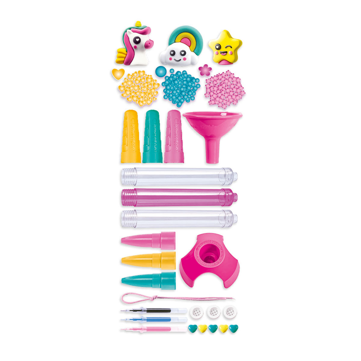Deine Stift-Kreationen - Fantasy. Ein originelles Kreativset, mit dem man 3 Stifte zusammenstellen und mit verschiedenen Dekorationen personalisieren kann, indem man aus 3 verschiedenen Themen auswählt. Ein praktisches und reichhaltig sortiertes Set, das pro Set Folgendes enthält: 3 Stifte, 3 verschiedenfarbige Tinten, 3 Figuren und alle Werkzeuge, um sie herzustellen. Ein neues IDEA-Set, mit dem die Kinder ihre Stifte mit zahlreichen Accessoires und Dekorationen gestalten und personalisieren können.