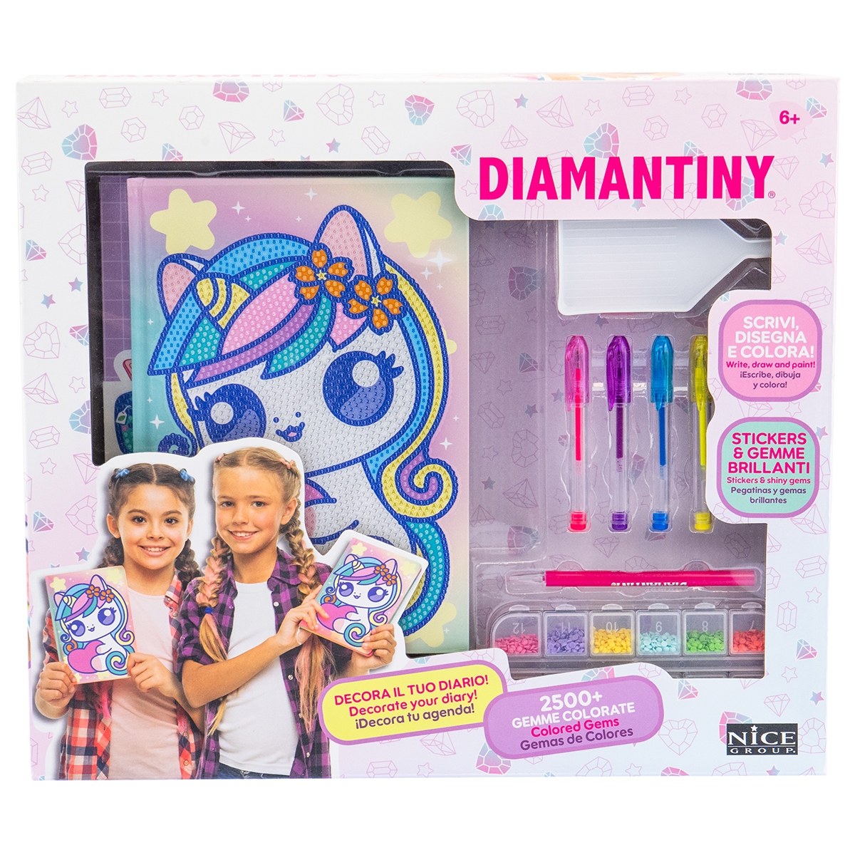 Diamantiny kawaii Tagebuch Einhorn mit Einband zum Verzieren mit Edelsteinen. Enthält: Tagebuch, Edelsteine, Edelsteinstift, Tablett und Wachs, 4 Farbstifte, Aufkleber und Sticker zum Verzieren mit Edelsteinen.