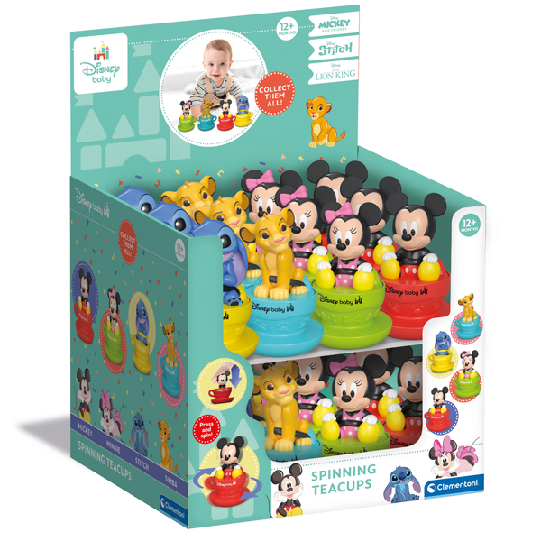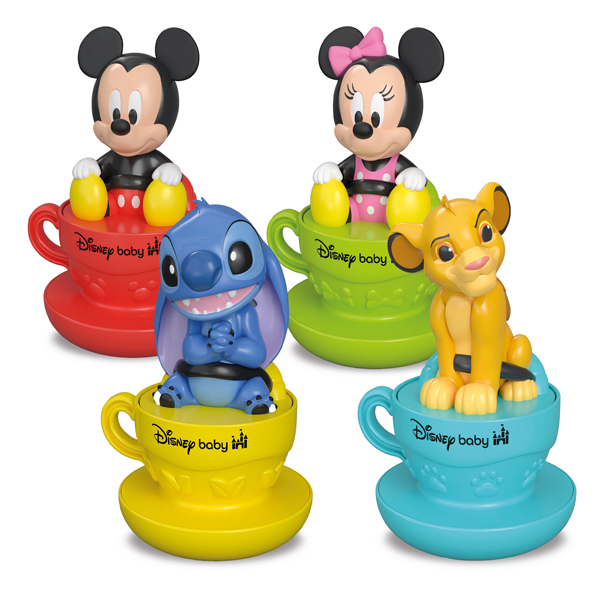 Disney Baby Tassen-Kreisel. Die farbenfrohen Tassen mit Mickey, Minnie, Donald Duck und Stitch verwandeln sich in lustige Kreisel. Das kultige Karussell der Disneyland-Tassen wird zum Spiel in vier superlustigen Versionen! Ideal, um das räumliche Vorstellungsvermögen und die manuellen Fähigkeiten des Kindes spielerisch zu fördern.