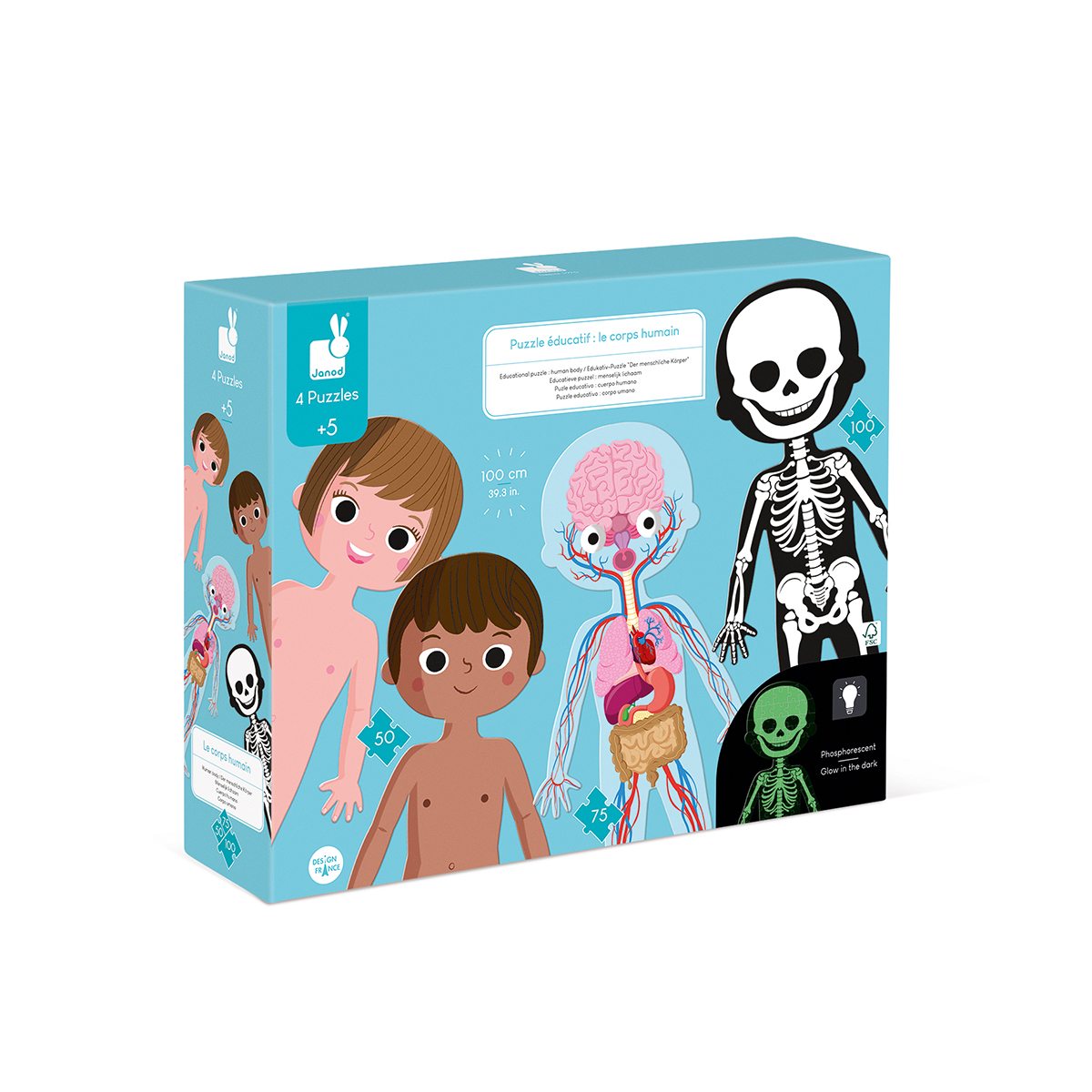 4 Riesenpuzzles, die den menschlichen Körper zeigen. 1 beidseitig bebildertes Puzzle mit 50 Mädchen-/Jungen-Puzzleteilen, 1 75-teiliges Puzzle mit den Organen, 1 Puzzle zum Thema Skelett mit 100 phosphoreszierenden Teilen. Die Puzzles sind einen Meter hoch und helfen Kindern, ihren Körper besser zu verstehen. Das Puzzle wird mit detaillierten, informativen Karten geliefert, welche die verschiedenen Teile des menschlichen Körpers vorstellen. Erhältlich in 12 Sprachen: Französisch, Englisch, Deutsch, Niederländisch, Polnisch, Russisch, Spanisch, Portugiesisch, Katalanisch, Italienisch, Slowakisch, Tschechisch.