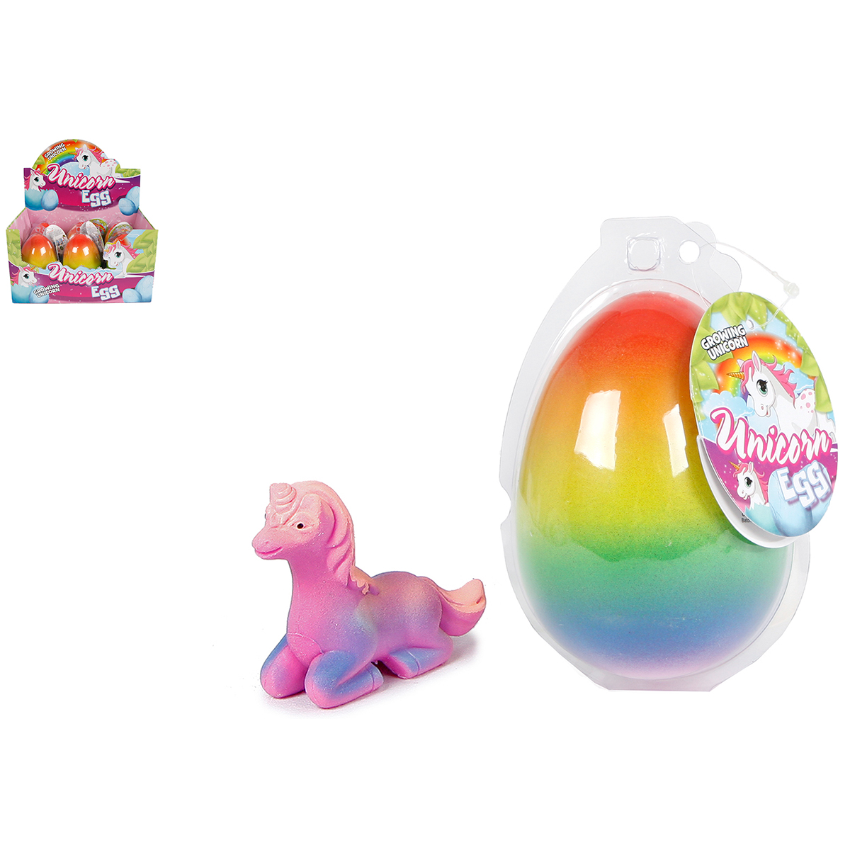 Das Ei muss 12 bis 24 Stunden im Wasser eingelegt werden, daraus entsteht ein Einhorn. Die Eier mit den wachsenden Einhörner werden assortiert in einem Display geliefert.