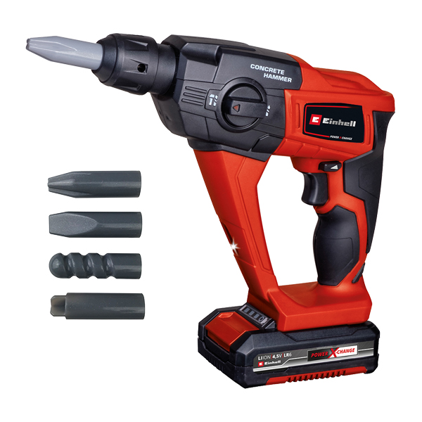 Einhell Bohrhammer KIDS, Links- und Rechtslauf, 4 Einsätze, Ein- und Ausschalter, austauschbare Batterieeinheit.