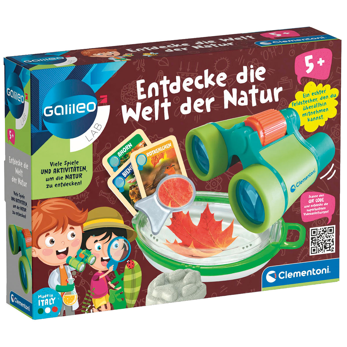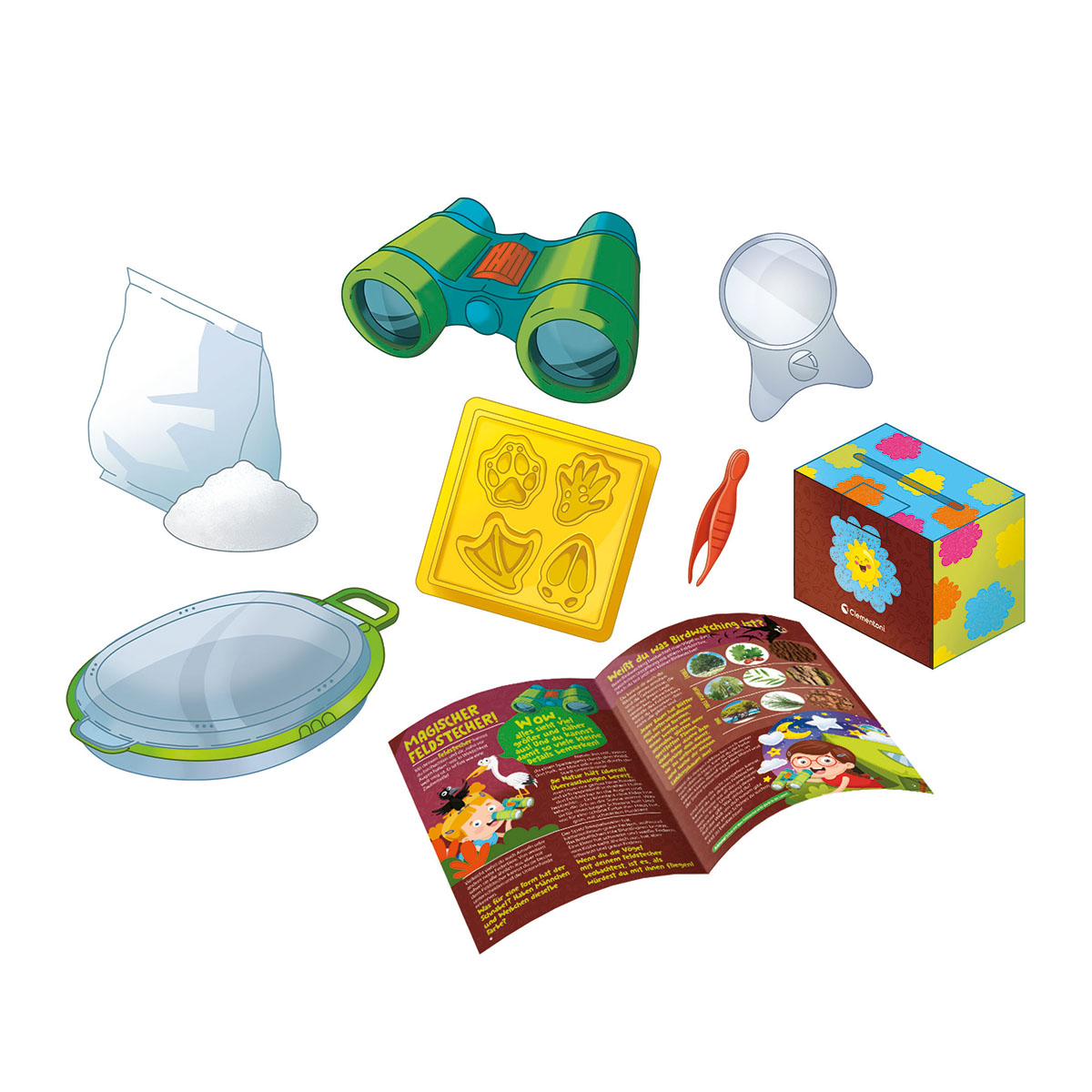 Das perfekte Spiel für kleine Entdecker! Erlebe unzählige Abenteuer im Kontakt mit der Natur! Ein Koffer mit allem notwendigen Zubehör, um Kinder an die Naturbeobachtung heranzuführen. Enthält ein Fernglas für die Vogelbeobachtung, eine spezielle Käfer-Lupe, Gipsformen zum Anfertigen von Pfotenabdrücken sowie Karten mit umfassenden Informationen über die Natur. Ein einfaches und fesselndes Spiel für den Spass im Freien, bei dem die Kinder in die Fussstapfen echter Entdecker treten können.