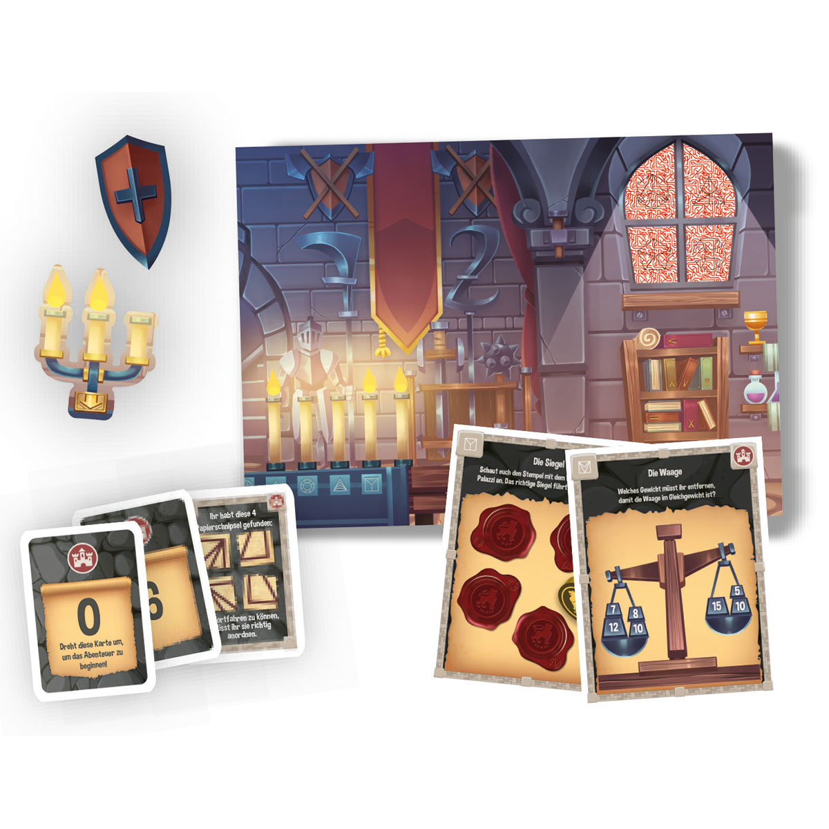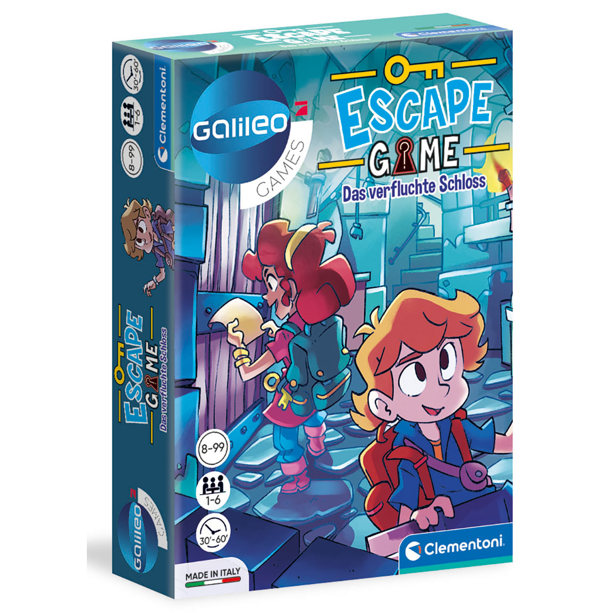 Escape Game - Das verfluchte Schloss. Ein Schloss, das geheimnisvolle Hinweise und Rätsel verbirgt, die nur ein guter Ermittler lösen kann. Für ein fesselndes Abenteuer, das Kinder und Erwachsene gleichermassen begeistert! Hinter jeder Karte verbirgt sich ein Hinweis, um das Abenteuer fortzusetzen und zu versuchen, das Schloss zu verlassen. Das Spiel enthält einen Satz Rätselkarten, ein Spielbrett und nützliche Gegenstände zum Auffinden der Hinweise. Ein Spiel, das dem aktuellen Trend des Escape Rooms folgt, um gemeinsam Spass zu haben und die Intelligenz zu fördern.