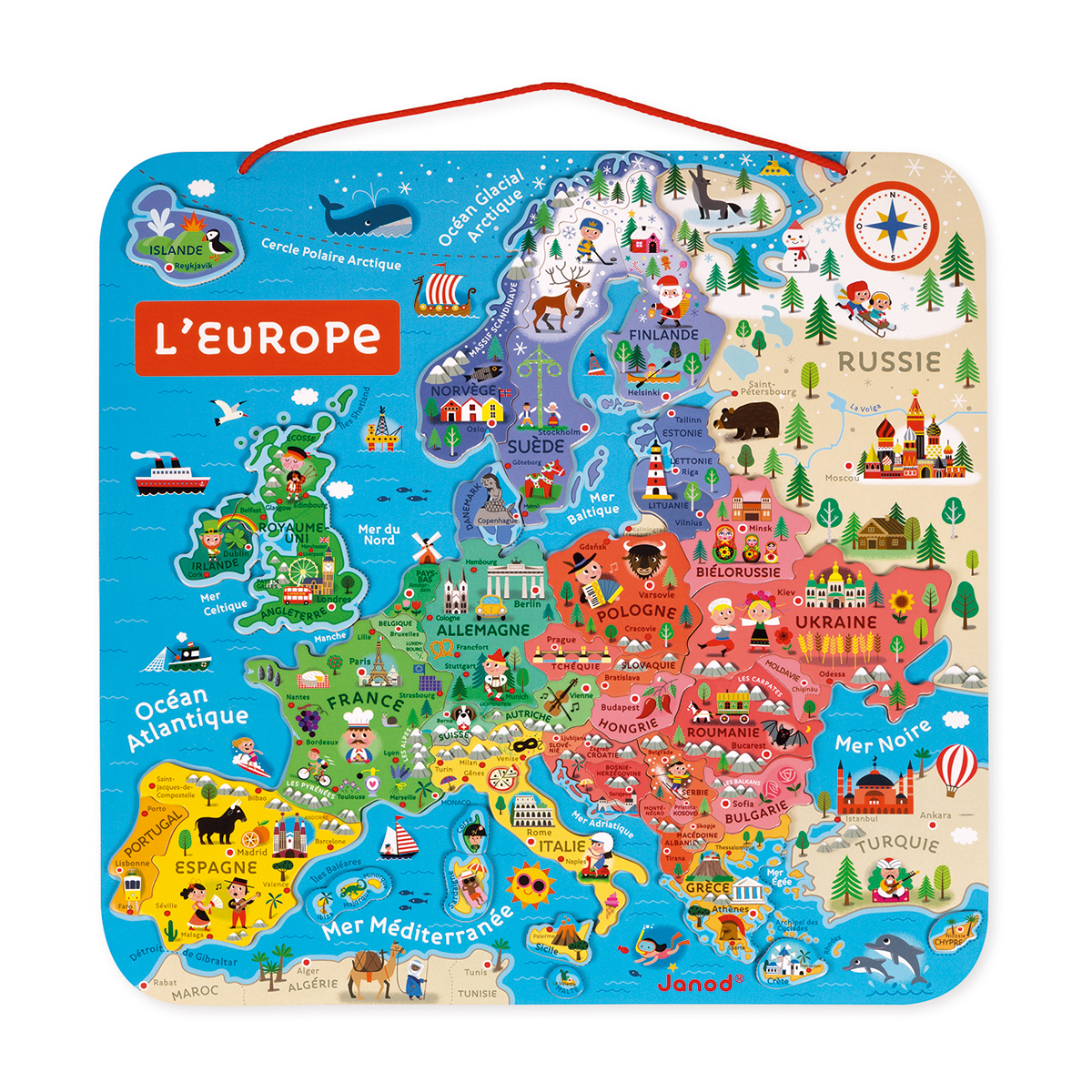 Lernen Sie Geographie und haben Sie Spass dabei! Jedes Magnet repräsentiert ein Land oder eine Region der Welt, mit seinem Namen, seiner Hauptstadt, usw. Die grosse Magnettafel repräsentiert Europa mit seinen verschiedenen Ländern, Meeren und Ozeanen. Viel Spass dabei, jedes Land an seinen Platz zu setzen, Sie erhalten eine schöne Europakarte, die Sie an die Wand hängen können. Eine unterhaltsame und lehrreiche Art und Weise ein kleines Stück des Planeten zu entdecken. 40 Magnete!