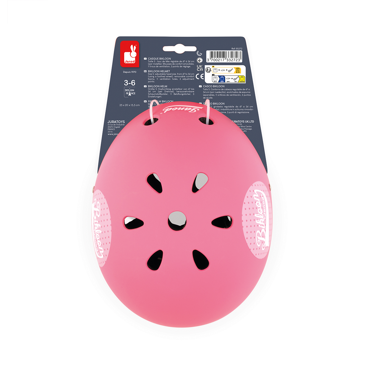 Mit dem coolen Fahrradhelm 25x20x15.5cm BIKLOON in pink können Kinder ab 3 Jahren geschützt Fahrrad fahren. Auch für den Tretroller oder beim Skaten ist dieser Kinderhelm geeignet. Der stabile Helm hat ein herausnehmbares Schaumstoffpolster. Dieses kann bei Bedarf gewaschen werden. Der Kinderhelm hat auch Lüftungslöcher für ein gutes Trageklima. Der Kinngurt ist in der Länge verstellbar und mit einem Clip schliessbar. Der Janod Fahrradhelm BIKLOON in rot kann von 47 auf 54 cm im Umfang angepasst werden.