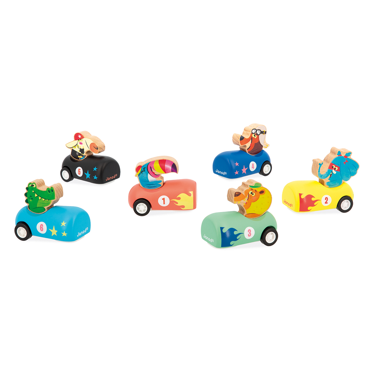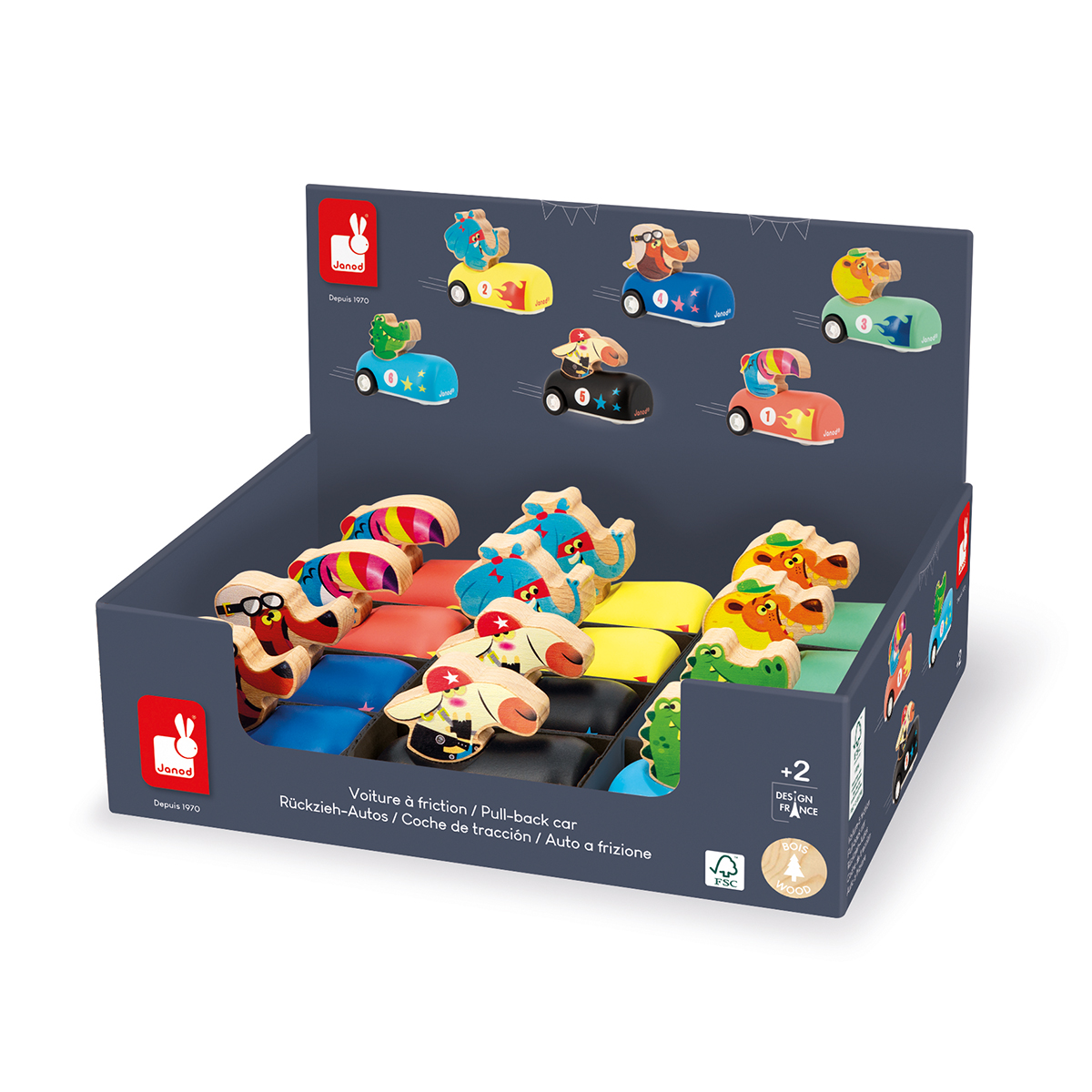 Tolle Rückziehautos zum Sammeln! Einfach das Auto rückwärts ziehen und loslassen, dann saust es wie ein echter Rennwagen von ganz allein los! Sobald es losgelassen wird, fährt es dank der Kugel an seiner Vorderseite in alle Richtungen. Jedes Modell ist mit einem drolligen und bunten Fahrer versehen. Zur Auswahl stehen 6 verschiedene Modelle. Sammle alle! Spielzeug aus Holz. Für Kinder ab 2 Jahren. Set mit 12 Rückziehautos: 2 x 6 Modelle mit jeweils einer anderen Zahl und einem anderen Motiv auf der Motorhaube. Erhältlich im Display mit einem Etikett an jedem Auto.