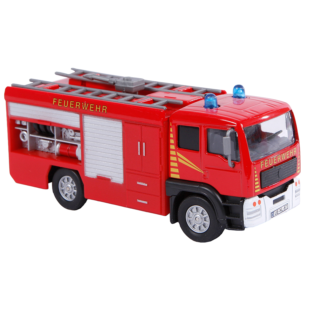Feuer ist ausgebrochen, schnell eilt die Feuerwehr mit Blinklicht und Sirene an den Unfallort. Feuerwehrauto mit Pull-Back Funktion. Die Verpackung hat eine "Try me" Funktion.