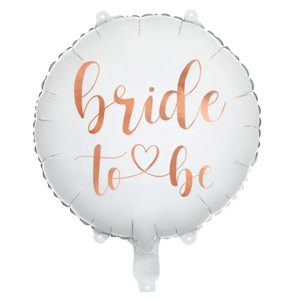 Folienballon Bride to be Weiß mit Aufschrift Bride in Roségold, Maße vor dem Aufblasen ca. 45 cm (18"), Maße nach dem Aufblasen ca. 35 cm (14"). Kann mit Luft oder Helium aufgeblasen werden. Inklusive Strohhalm.