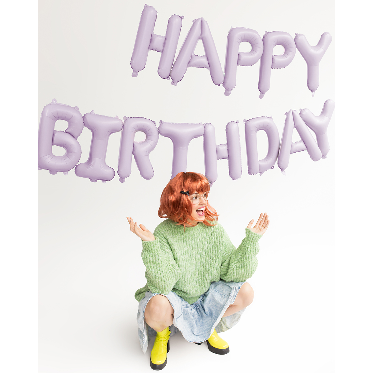 Matter Happy Birthday Folienballon in Lila, Masse ca. 340 x 35 cm. Zum Aufblasen mit Luft. Der Ballon ist selbstverschliessend und hat 4 Haken zur einfachen Befestigung an einem Band.