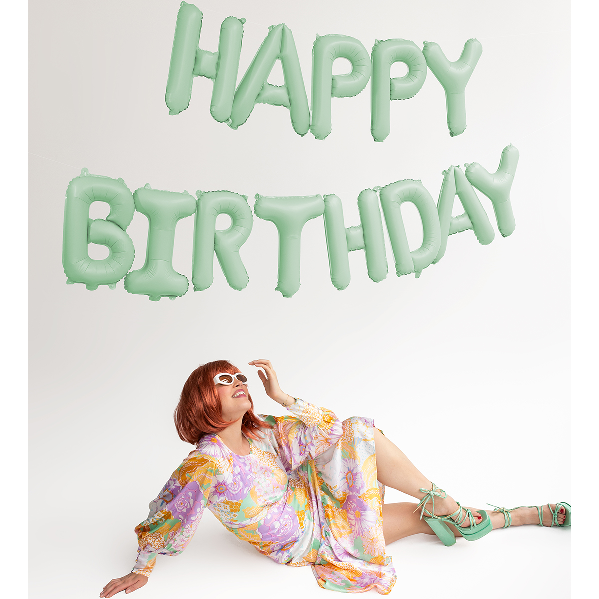 Matter Happy Birthday Folienballon in grün, Masse ca. 340 x 35 cm. Zum Aufblasen mit Luft. Der Ballon ist selbstverschliessend und hat 4 Haken zur einfachen Befestigung an einem Band.