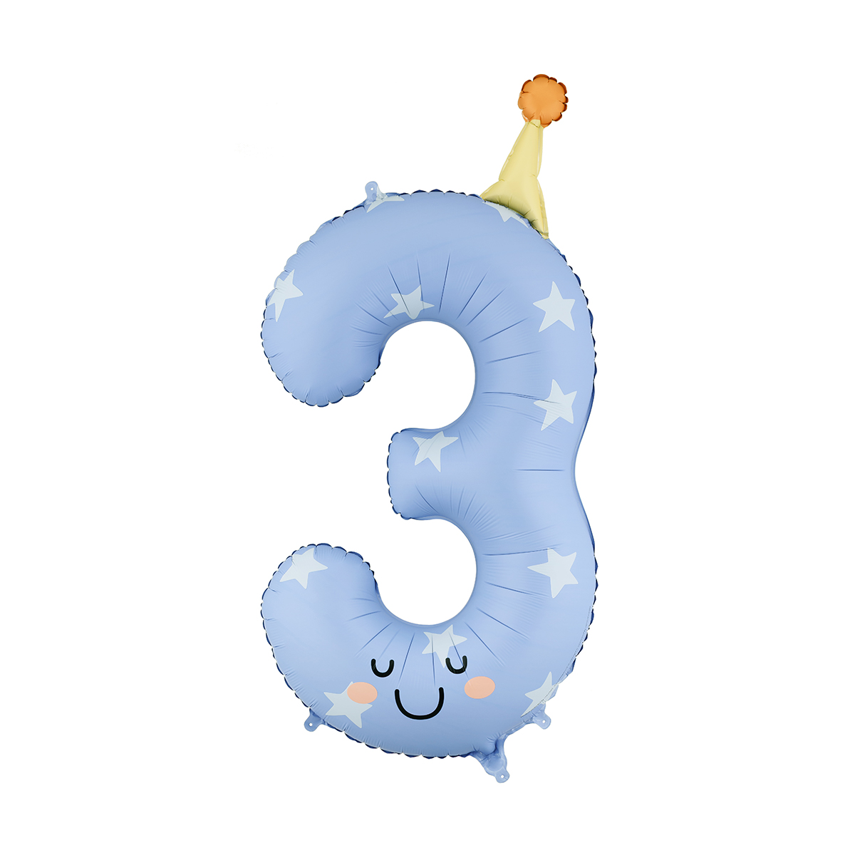Mattierter Folienballon Zahl 3 in blau mit bunter Mütze. Grösse vor dem Aufblasen ca. 95 cm, Grösse nach dem Aufblasen ca. 86 cm. Zum Befüllen mit Luft und Helium. Set enthält einen Trinkhalm.