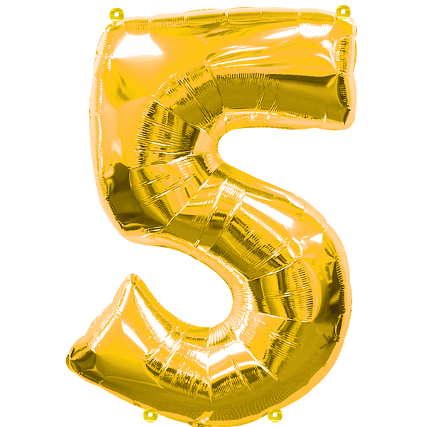 Goldener Folienballon Zahl 5 Grösse: 86 cm. Der ideale Ballon zum Geburtstag, oder zum Jubiläum. Ein strapazierfähiger Folienballon mit einem selbstschliessenden Automatikventil. Der Ballon hat ein Patentventil eingebaut und kann mehrfach aufgeblasen werden.