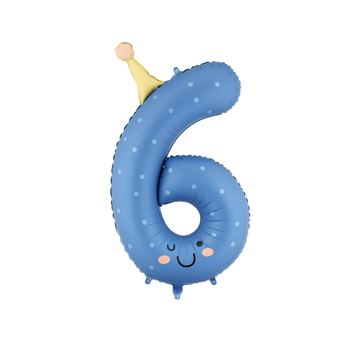 Mattierter Folienballon Zahl 6 in blau mit bunter Mütze. Grösse vor dem Aufblasen ca. 95 cm, Grösse nach dem Aufblasen ca. 86 cm. Zum Befüllen mit Luft und Helium. Set enthält einen Trinkhalm.