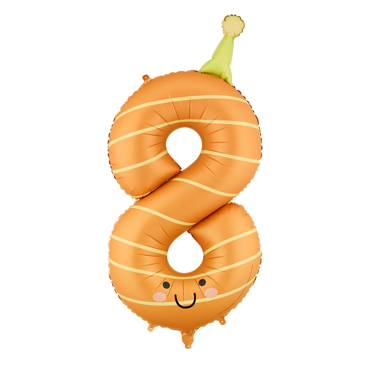 Mattierter Folienballon Zahl 8 in orange mit bunter Mütze. Grösse vor dem Aufblasen ca. 95 cm, Grösse nach dem Aufblasen ca. 86 cm. Zum Befüllen mit Luft und Helium. Set enthält einen Trinkhalm.