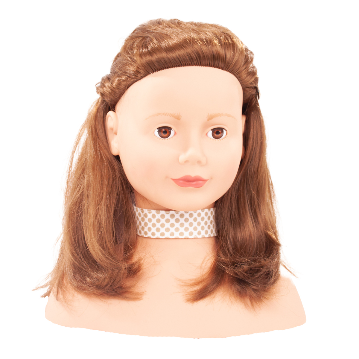 Götz Frisier- und Schminkkopf, 58tlg., mit Schminke und Haaraccessoires, braune Haare, braune, gemalte Augen. Haare: lauwarmes Wasser, mildes Babyshampoo waschbar, rutschfest durch Saugnäpfe.