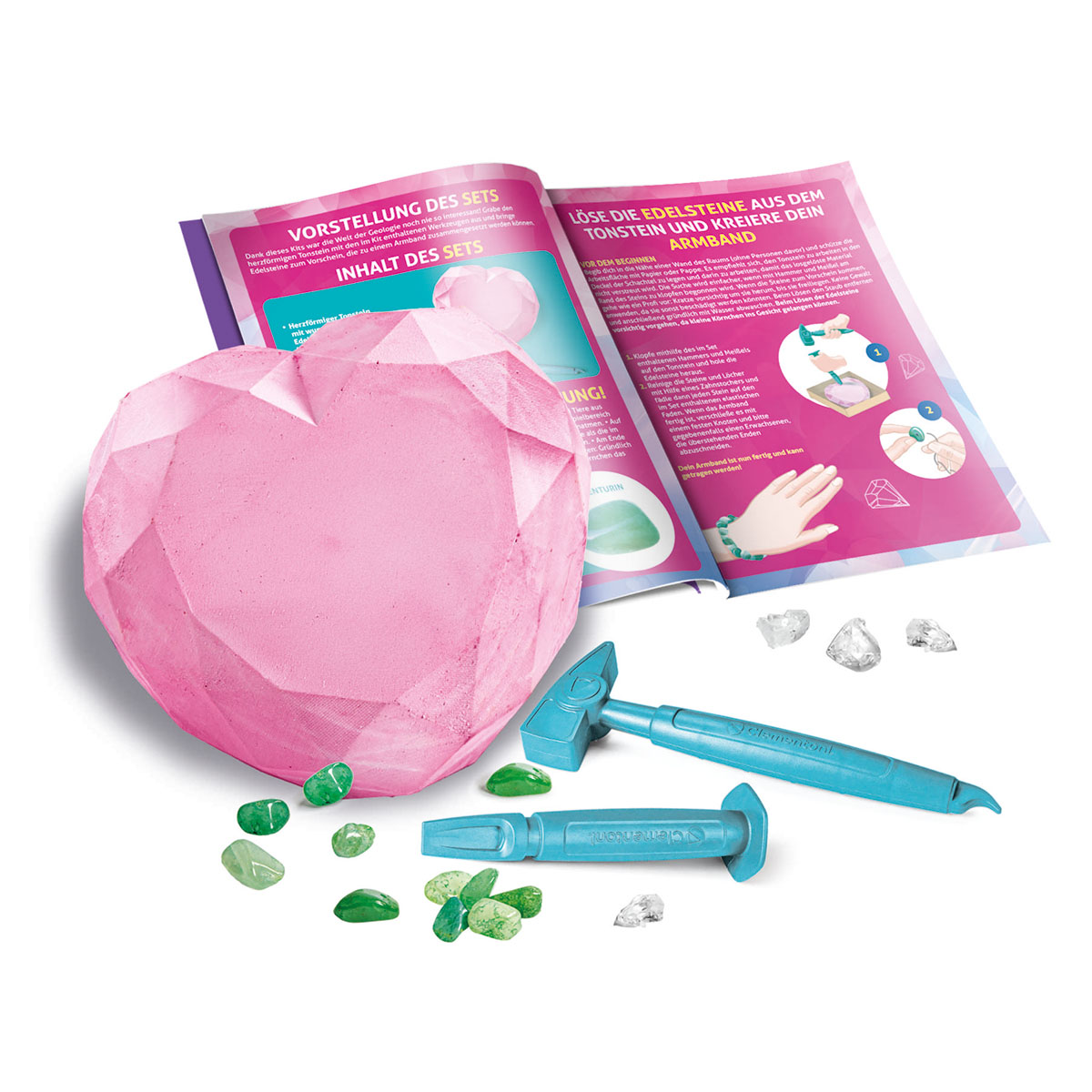 Schmuck-Ausgrabungs-Set. Grabe in dem BLock und entdecke echte Edelsteine, die du in ein einzigartiges Armband verwandeln kannst. Eine umfassende Aktivität, die Aufmerksamkeit, Geschicklichkeit und Kreativität fördert. Ein Komplettset mit Werkzeug, Edelsteinen und Bändern, um gleich kreativ werden zu können.