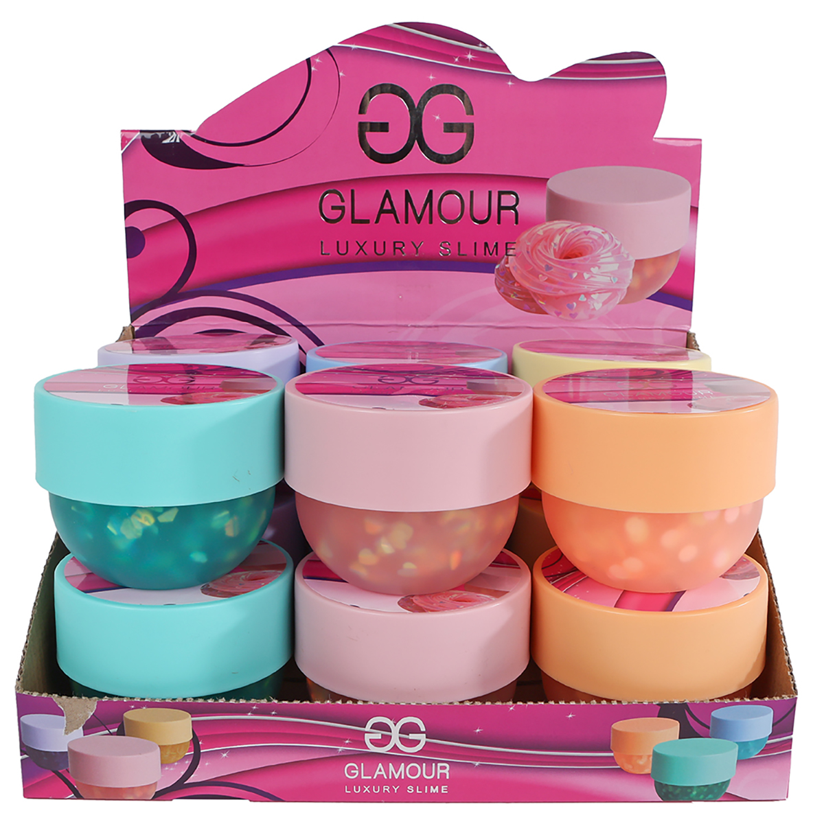 Glamour Crystal Slime im Kosmetiktiegel 7.6cm, 160 ml 6-fach assortiert in Display.