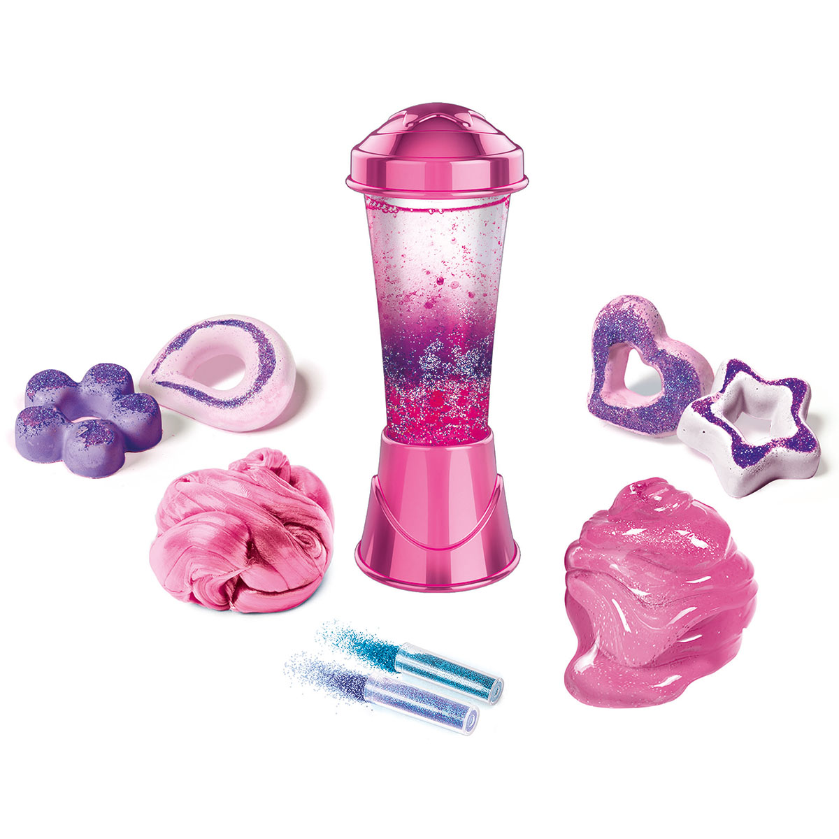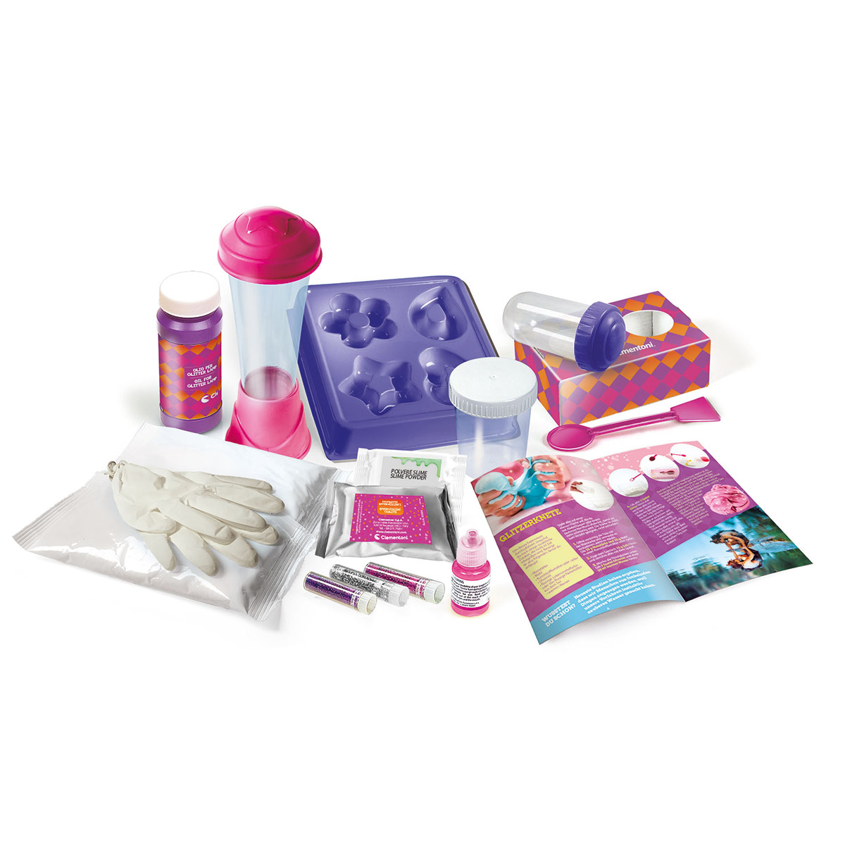 Glitter-Labor. Mit dem Mini-Ausstecher kann Glitzer hergestellt werden, mit dem alle Kreationen, die das Ergebnis der Experimente aus dem Set sind, individuell gestaltet und dekoriert werden können. Das Set enthält auch eine Lavalampe, die für das Kinderzimmer zusammengebaut und entsprechend dem aktuellen Trend dekoriert werden kann. Die bebilderte und illustrierte Anleitung erklärt, wie man herrlich glitzernden Schleim herstellt oder Gegenstände mit originellen Glitzereffekten dekoriert. Zusätzlich zum kreativen Element können Kinder einfache chemische Reaktionen entdecken und mit ihnen experimentieren. So können sie die Naturwissenschaft auf unterhaltsame und praktische Weise erlernen.