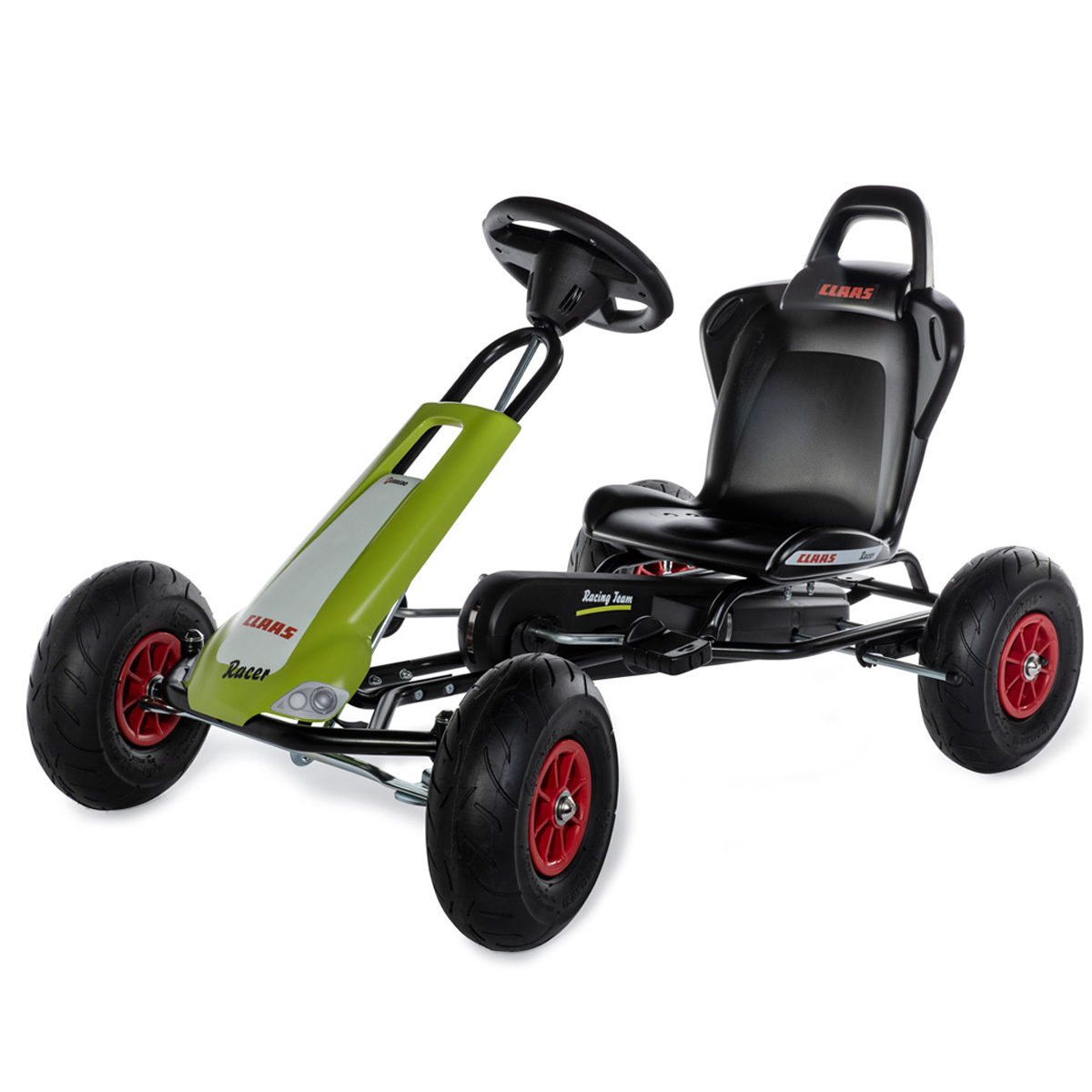 Das Ferbedo GoKart CLAAS Racer ist ein hochwertiges Fahrzeug für Kinder im Alter von ca. 3 bis 8 Jahren. Der robuste Stahlrahmen in elegantem Schwarz sorgt für eine hohe Stabilität und Langlebigkeit des GoKarts. Dank des Ferbedo Freilaufs kann das Kind mühelos vor- und zurückfahren, ohne dabei schalten zu müssen. Dies ermöglicht eine einfache Bedienung und ein unkompliziertes Fahrerlebnis. Zudem ist der Wendekreis des GoKarts optimiert, was eine gute Manövrierfähigkeit gewährleistet. Der ergonomisch geformte und verstellbare Sitz sorgt für einen bequemen und individuell anpassbaren Sitzkomfort. Die Luftbereifung bietet eine gute Bodenhaftung und ermöglicht ein ruhiges Fahrverhalten auf verschiedenen Untergründen. Für zusätzliche Sicherheit verfügt das GoKart über eine Handbremse, die jederzeit leicht zu bedienen ist. Das Ferbedo Soundlenkrad sorgt für extra Spielspass und realistische Geräusche während der Fahrt. Das GoKart ist belastbar bis zu 50 kg, sodass es auch älteren Kindern noch viel Freude bereiten kann. Das Ferbedo GoKart CLAAS Racer wird in Deutschland hergestellt und steht somit für höchste Qualität und Verarbeitung. Es ist ein ideales Fahrzeug für aktive Kinder, die gerne draussen spielen und ihre motorischen Fähigkeiten trainieren möchten.