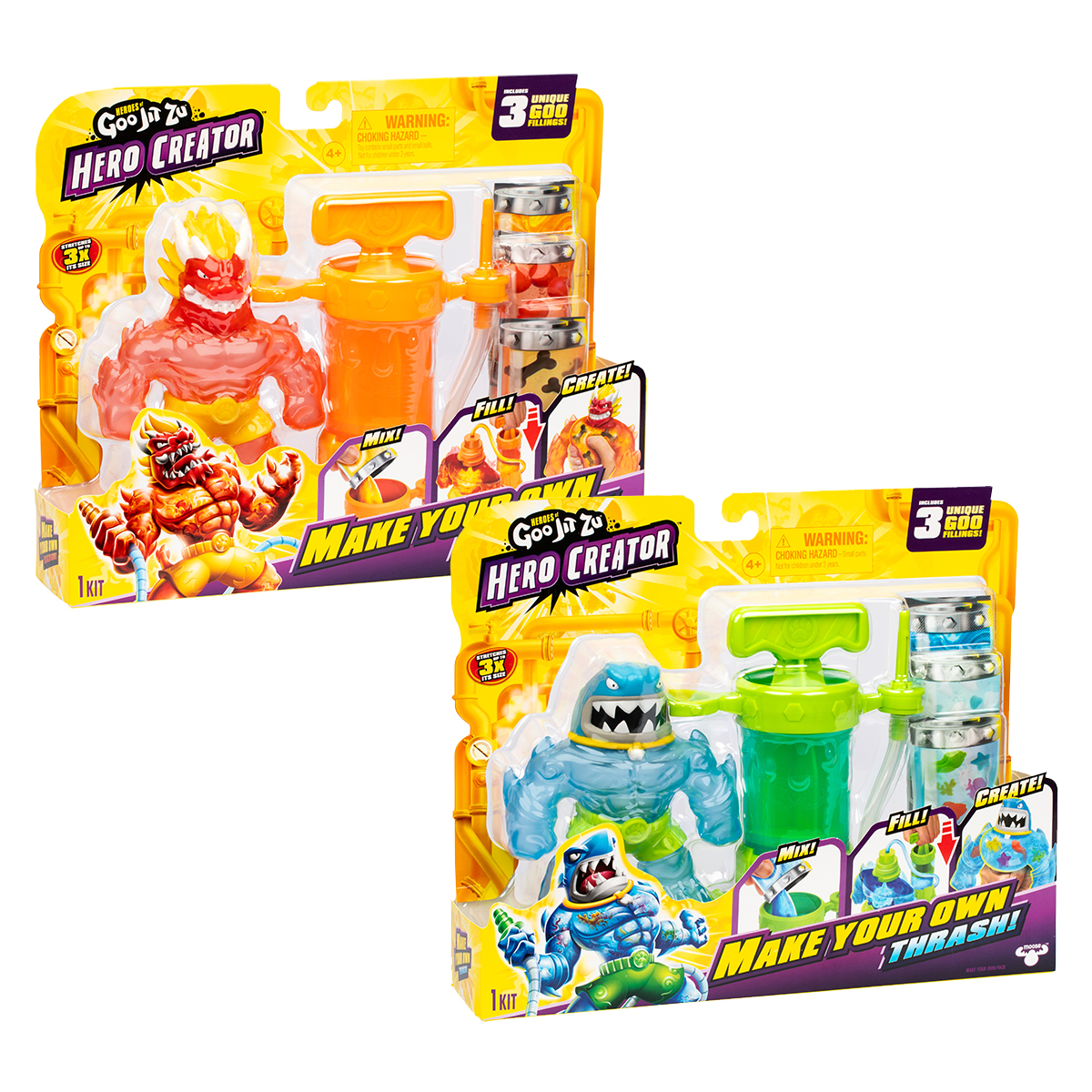 Wir stellen den NEUEN Heroes of Goo Jit Zu Hero Creator vor! Zum allerersten Mal hast Du die Möglichkeit, dein EIGENES Goo Jit Zu zu erschaffen! Der Rockjaw Goo Jit Zu Hero Creator wird mit 3 einzigartigen Goo-Füllungen geliefert, die du in Rockjaw füllen kannst! Dazu gehören: Felsbrocken, Schlangen und Glibber! Du kannst den Erstellungsprozess immer wieder wiederholen! Befestige Rockjaw in der speziellen Schöpferkammer und fülle Deine Actionfigur mit 3 einzigartigen Füllungen! Füge Wasser hinzu, pumpe den Körper der Figur mit Glibber voll und beobachte, wie Rockjaw vor deinen Augen zum Leben erweckt wird! Nach der Erschaffung kannst du Rockjaw bis zur 3-fachen Größe dehnen! (Bis zu 50 cm)